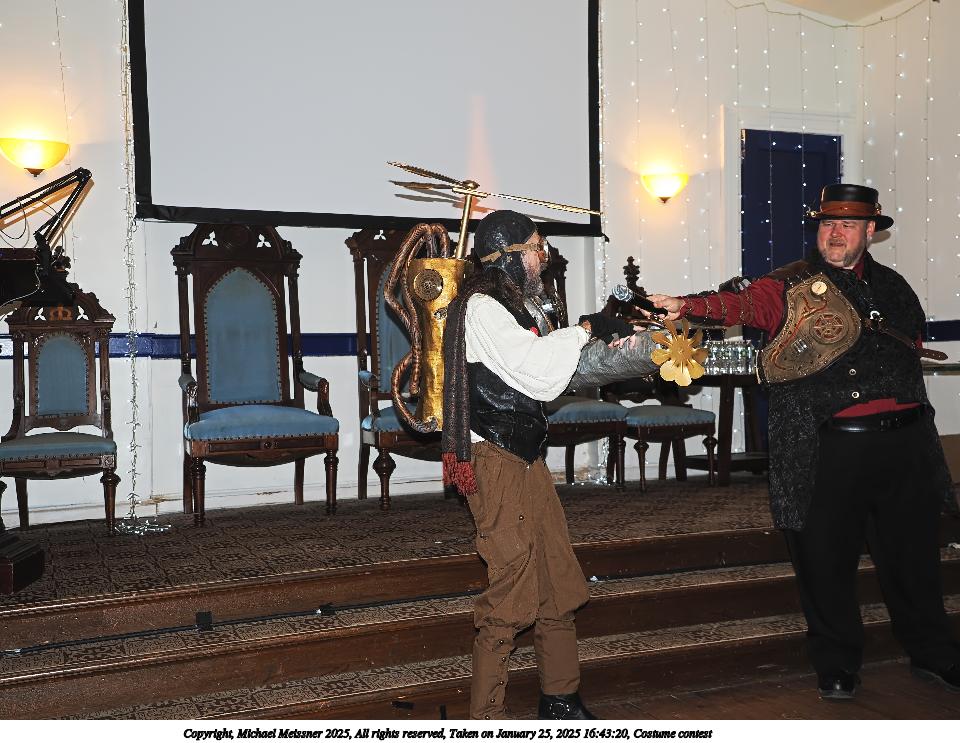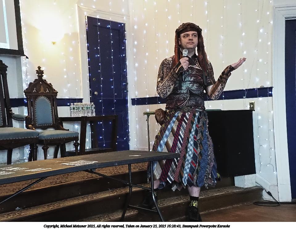 Picture #72: Steampunk Powerpoint Karaoke #3 Small: 960x743, 146,449 bytes (144K), (html file) Large: 4800x3600, 2,793,607 bytes (2.7M), (html file) Copyright, Michael Meissner 2025, All rights reserved Olympus E-M1-II camera with Olympus-m43 12-40mm f/2.8 lens f/2.8, ISO 2500, 1/60 sec, 12.0mm, auto mode, natural color, SHQ, matrix metering, digital zoom x2, IS Auto, both eyes priority, face detection, anti-shock 35mm equivalent focal length 48.0mm, digital zoom x2 Programs used: crop, raw therapee Taken by Michael Meissner on January 25, 2025 16:28:43 Last modified on February 01, 2025 at 20:07 |