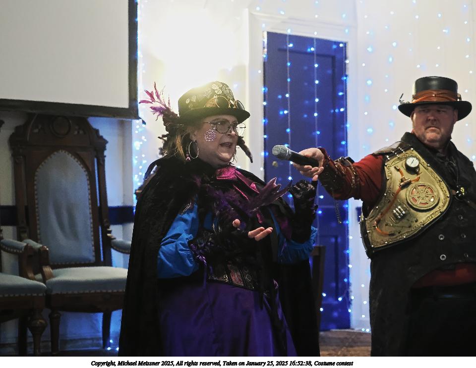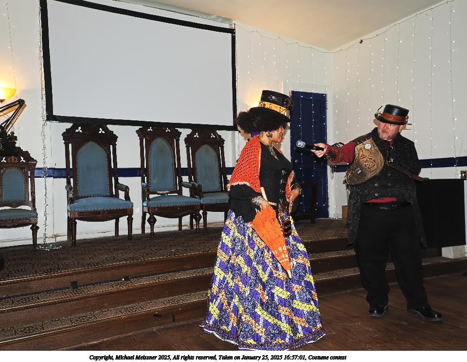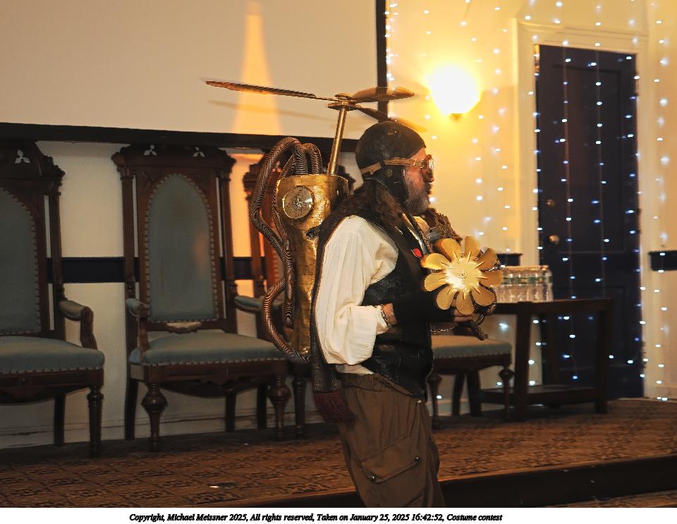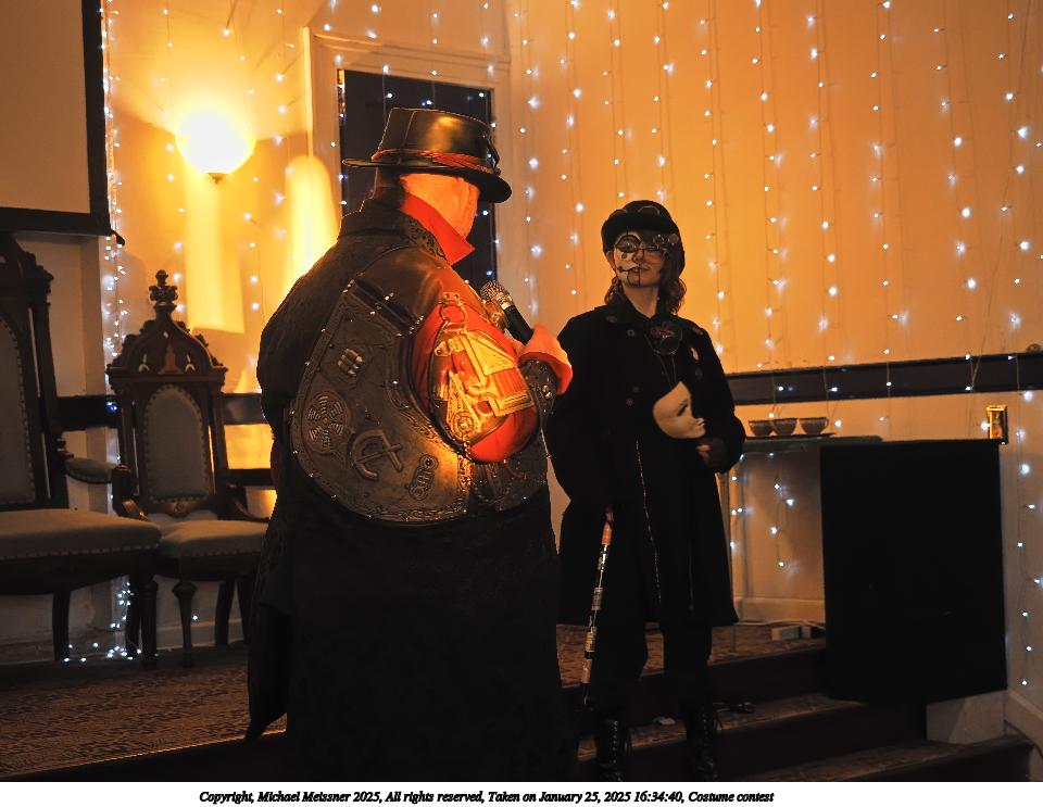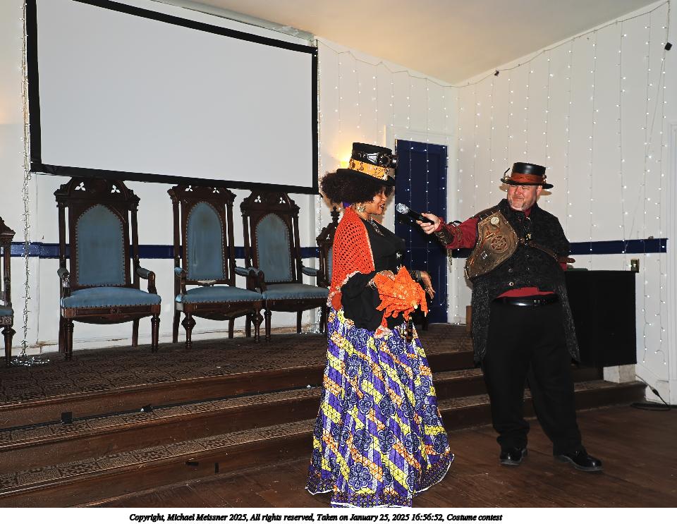 Picture #99: Costume contest #22 Small: 800x623, 85,270 bytes (84K), (html file) Large: 3200x2400, 2,718,332 bytes (2.6M), (html file) Copyright, Michael Meissner 2025, All rights reserved Olympus E-M1-II camera with Olympus-m43 12-40mm f/2.8 lens f/3.2, ISO 6400, 1/60 sec, 12.0mm, auto mode, natural color, SHQ, matrix metering, IS Auto, both eyes priority, face detection, anti-shock 35mm equivalent focal length 24.0mm Programs used: crop, gimp, raw therapee Taken by Michael Meissner on January 25, 2025 17:50:01 Last modified on February 01, 2025 at 20:21 |