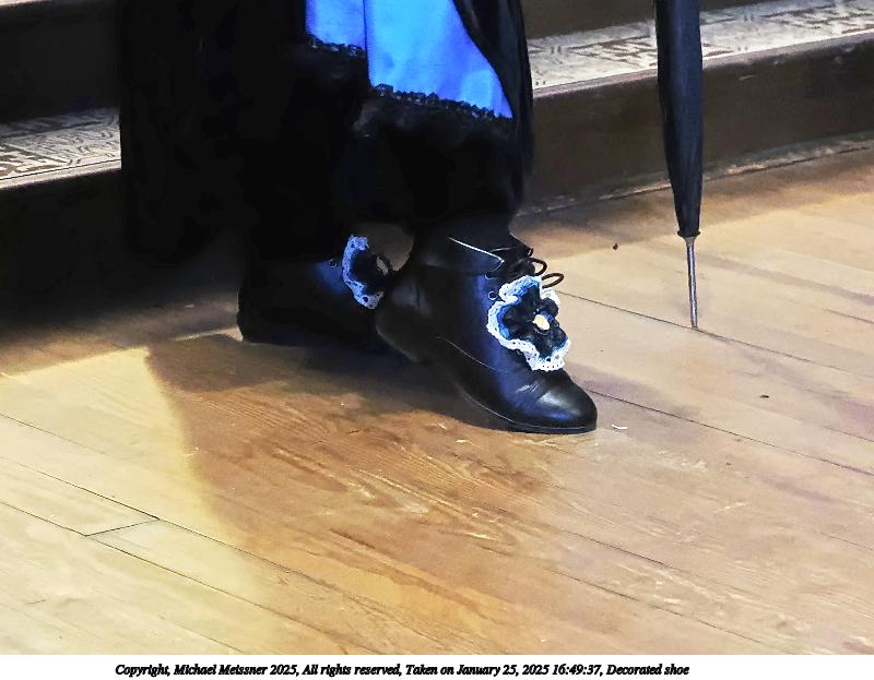Picture #89: Decorated shoe Small: 800x623, 83,995 bytes (83K), (html file) Large: 2400x1800, 2,189,032 bytes (2.1M), (html file) Copyright, Michael Meissner 2025, All rights reserved OM OM1 camera with Olympus-m43 12-40mm f/2.8 lens f/2.8, ISO 8000, 1/60 sec, 34.0mm, auto mode, vivid color, matrix metering, continous focus, IS Auto, face detection, anti-shock 35mm equivalent focal length 68.0mm Programs used: crop, gimp, raw therapee Taken by Michael Meissner on January 25, 2025 16:49:37 Last modified on February 01, 2025 at 20:16 |