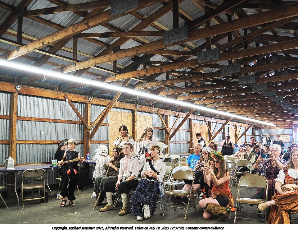 Picture #2: Costume contest audience Small: 960x743, 241,972 bytes (237K), (html file) Large: 4800x3600, 6,437,992 bytes (6.1M), (html file) Copyright, Michael Meissner 2025, All rights reserved OM OM3 camera with Olympus-m43 14-150mm-II f/4.0-5.6 lens f/4.5, ISO 1250, 1/60 sec, 22.0mm, auto mode, vivid color, matrix metering, IS Auto, face detection, subject human 35mm equivalent focal length 44.0mm Programs used: crop, raw therapee Taken by Michael Meissner on July 19, 2025 12:32:25 Last modified on August 06, 2025 at 22:56 |