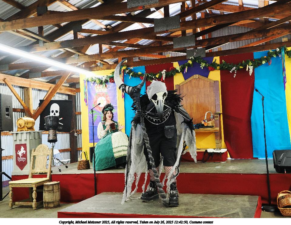 Picture #52: Costume contest #50 Small: 960x743, 220,869 bytes (216K), (html file) Large: 4800x3600, 5,851,010 bytes (5.6M), (html file) Copyright, Michael Meissner 2025, All rights reserved OM OM1 camera with Olympus-m43 12-40mm f/2.8 lens f/2.8, ISO 1250, 1/125 sec, 16.0mm, auto mode, vivid color, matrix metering, IS Auto, face detection, anti-shock 35mm equivalent focal length 32.0mm Programs used: crop, raw therapee Taken by Michael Meissner on July 26, 2025 12:41:14 Last modified on August 12, 2025 at 00:25 |