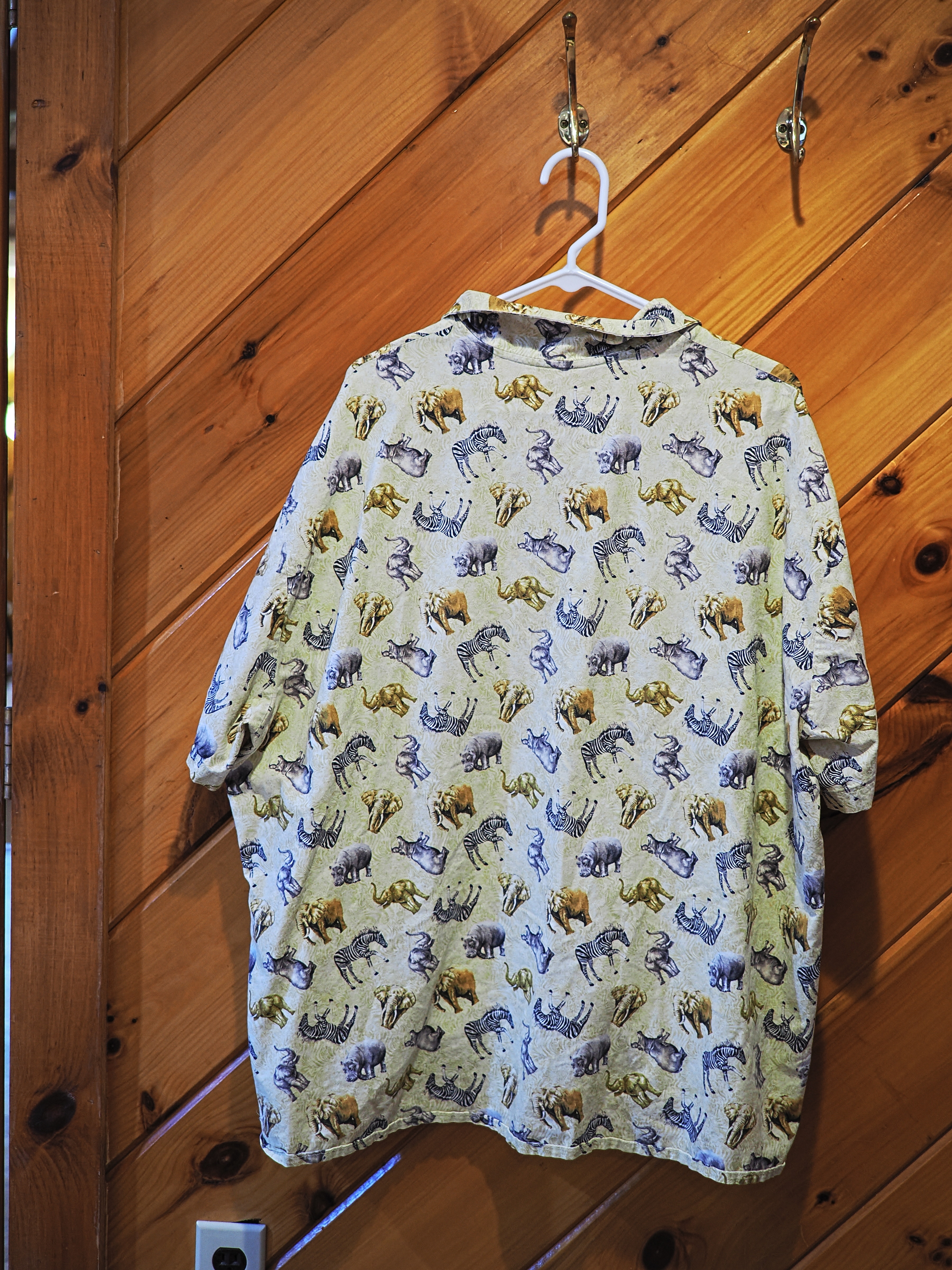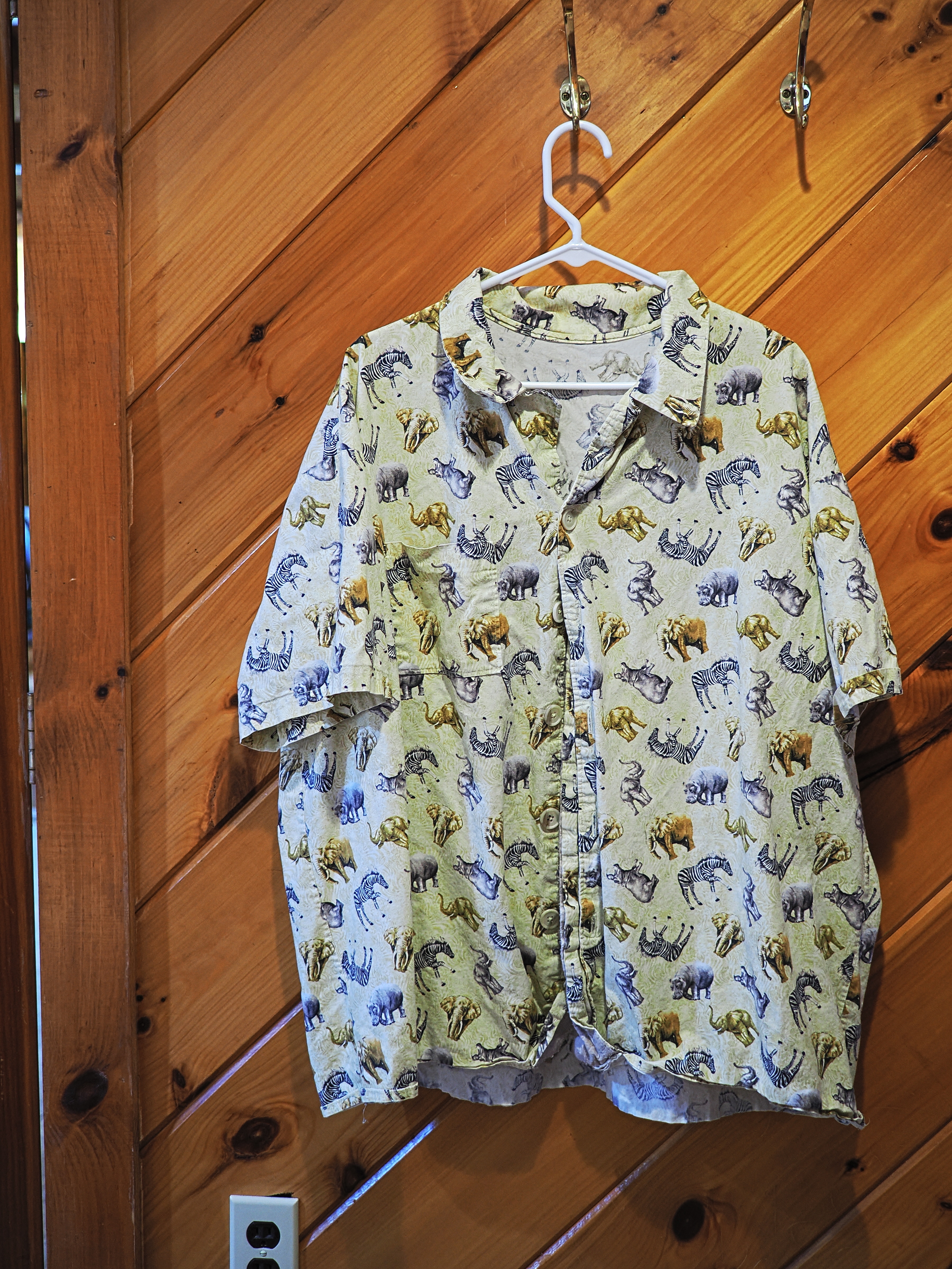 Picture #22: African animal shirt Small: 750x1023, 277,272 bytes (271K), (html file) Large: 3000x4000, 5,215,637 bytes (5.0M), (html file) Copyright, Michael Meissner 2025, All rights reserved OM OM3 camera with OM 20mm f/1.4 lens f/1.4, ISO 800, 1/60 sec, 20.0mm, auto mode, vivid color, matrix metering, IS Auto, face detection, anti-shock 35mm equivalent focal length 40.0mm Programs used: crop, raw therapee, rotate left Taken by Michael Meissner on August 25, 2025 21:46:13 Last modified on August 25, 2025 at 23:17 |