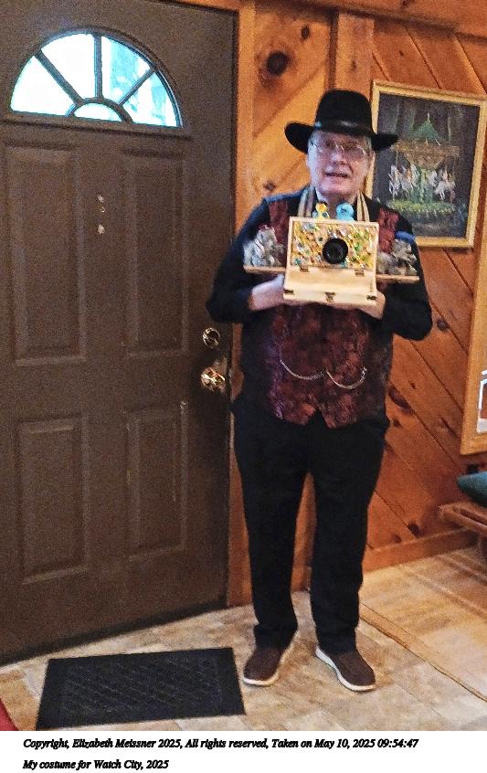 Picture #1: My costume for Watch City, 2025 Small: 533x846, 92,261 bytes (91K), (html file) Large: 1600x2400, 3,600,285 bytes (3.4M), (html file) Copyright, Elizabeth Meissner 2025, All rights reserved Samsung A32 5G phone f/1.8, ISO 1600, 1/15 sec, 4.6mm, auto mode, center weight metering 35mm equivalent focal length 25.0mm Programs used: gimp, raw therapee, rotate right Taken by Elizabeth Meissner on May 10, 2025 09:54:47 Last modified on May 11, 2025 at 16:24 |