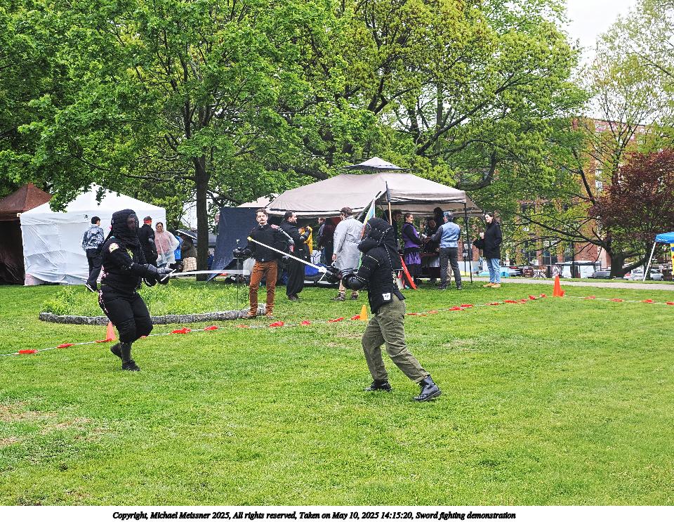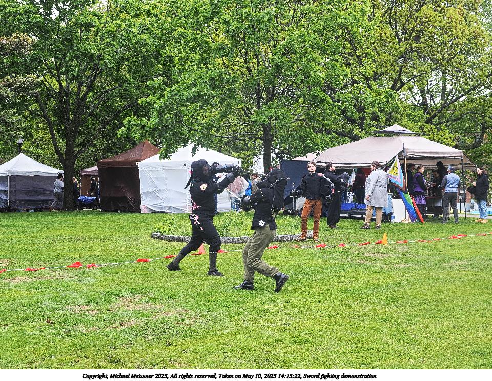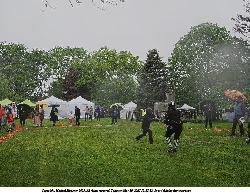 Picture #67: Sword fighting demonstration #4 Small: 960x743, 332,027 bytes (325K), (html file) Large: 4800x3600, 9,212,426 bytes (8.8M), (html file) Copyright, Michael Meissner 2025, All rights reserved OM OM1 camera with Olympus-m43 12-40mm f/2.8 lens f/5.0, ISO 200, flash, 1/200 sec, 28.0mm, auto mode, vivid color, matrix metering, continous focus, IS Auto, face detection, anti-shock 35mm equivalent focal length 56.0mm Programs used: crop, raw therapee Taken by Michael Meissner on May 10, 2025 14:15:22 Last modified on May 11, 2025 at 21:25 |