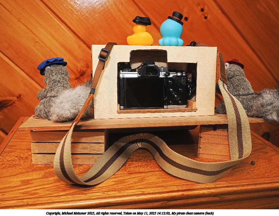 Picture #4: My pirate chest camera (back) Small: 960x743, 168,497 bytes (165K), (html file) Large: 4800x3600, 4,789,871 bytes (4.6M), (html file) Copyright, Michael Meissner 2025, All rights reserved OM OM1 camera with Olympus-m43 12-40mm f/2.8 lens f/2.8, ISO 200, FL-50R flash, 1/60 sec, 17.0mm, auto mode, vivid color, matrix metering, continous focus, IS Auto, face detection, anti-shock 35mm equivalent focal length 34.0mm Programs used: crop, raw therapee Taken by Michael Meissner on May 11, 2025 14:12:02 Last modified on May 11, 2025 at 16:36 |