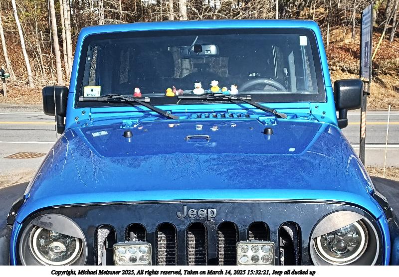 Picture #1: Jeep all ducked up 800x556, 138,887 bytes (136K), (html file) Copyright, Michael Meissner 2025, All rights reserved Samsung A32 5G phone f/1.8, ISO 32, 1/241 sec, 4.6mm, auto mode, center weight metering 35mm equivalent focal length 25.0mm Programs used: raw therapee, rotate right Taken by Michael Meissner on March 14, 2025 15:32:21 Last modified on March 15, 2025 at 18:59 |