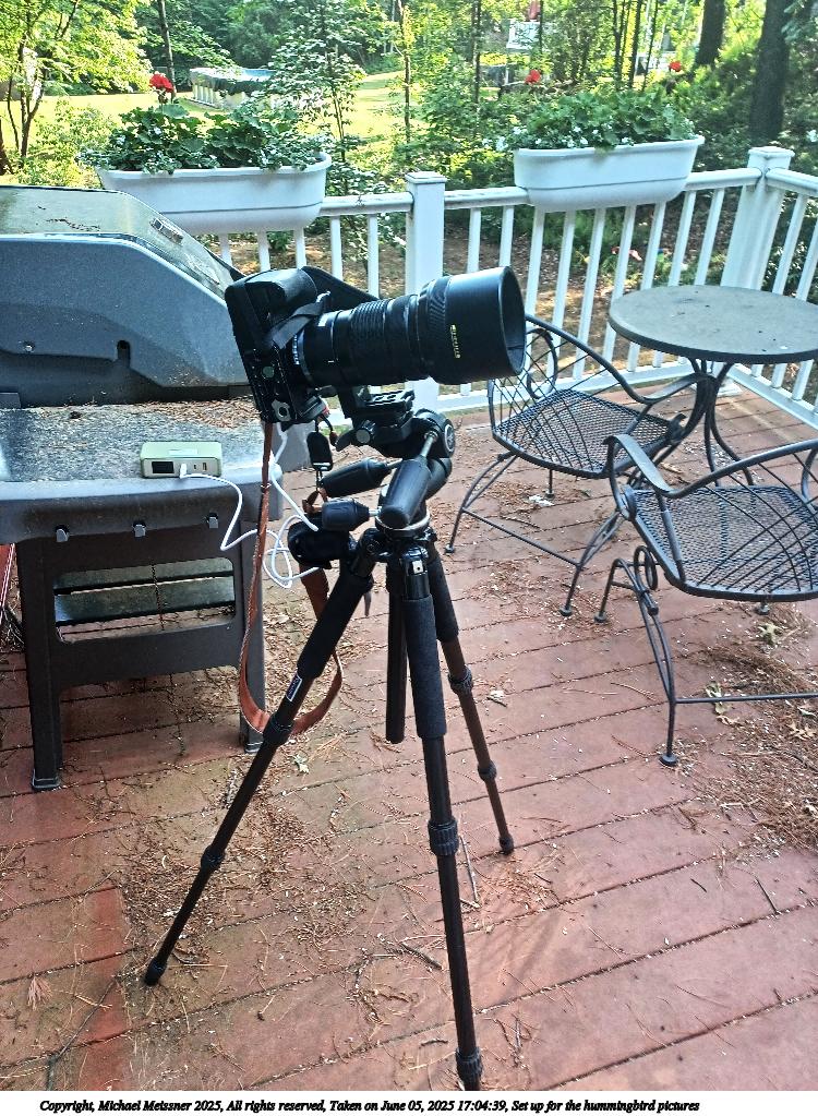 Picture #1: Set up for the hummingbird pictures 750x1023, 239,591 bytes (234K), (html file) Copyright, Michael Meissner 2025, All rights reserved Samsung A32 5G phone f/1.8, ISO 100, 1/60 sec, 4.6mm, auto mode, spot metering 35mm equivalent focal length 25.0mm Programs used: crop, raw therapee, rotate right Taken by Michael Meissner on June 05, 2025 17:04:39 Last modified on June 06, 2025 at 01:26 |