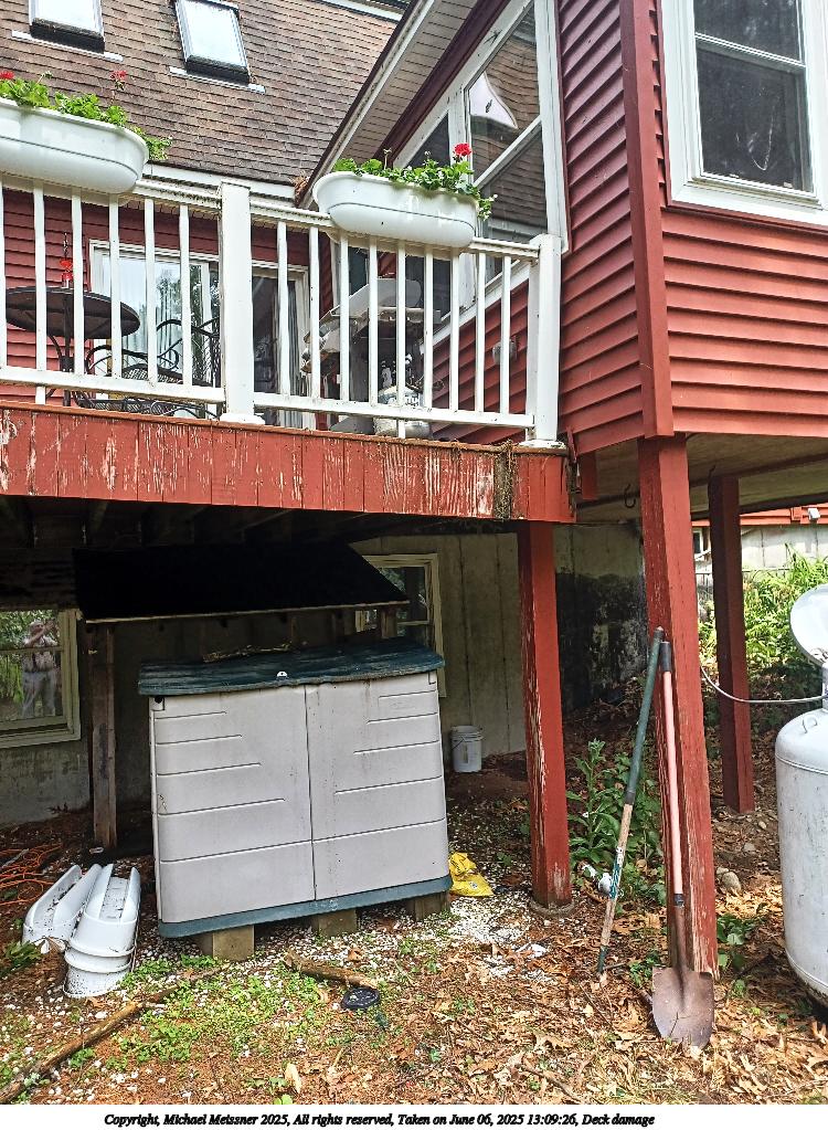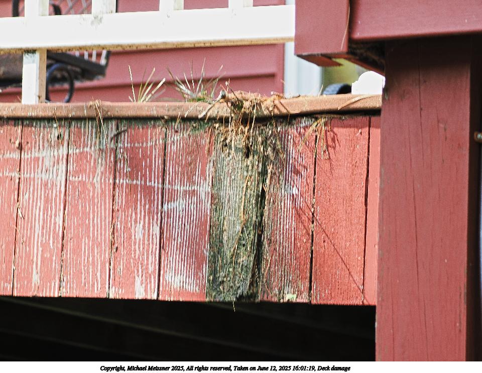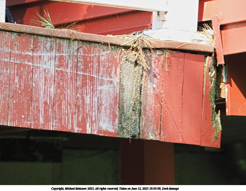 Picture #15: Deck damage #3 960x743, 160,337 bytes (157K), (html file) Copyright, Michael Meissner 2025, All rights reserved OM OM3 camera with Olympus-m43 100-400mm f/5.0-6.3 lens f/5.0, ISO 320, 1/60 sec, 100.0mm, auto mode, vivid color, matrix metering, bias 0.7, continous focus, IS Auto, face detection, anti-shock 35mm equivalent focal length 200.0mm Programs used: crop, raw therapee Taken by Michael Meissner on June 12, 2025 16:01:19 Last modified on June 15, 2025 at 22:54 |