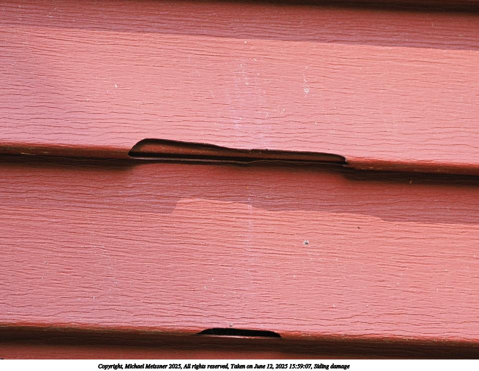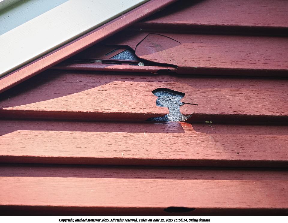 Picture #14: Siding damage #2 960x743, 145,657 bytes (143K), (html file) Copyright, Michael Meissner 2025, All rights reserved OM OM3 camera with Olympus-m43 100-400mm f/5.0-6.3 lens f/6.3, ISO 500, 1/60 sec, 244.0mm, auto mode, vivid color, matrix metering, bias 0.7, continous focus, IS Auto, face detection, anti-shock 35mm equivalent focal length 489.0mm Programs used: crop, raw therapee Taken by Michael Meissner on June 12, 2025 15:59:07 Last modified on June 15, 2025 at 22:53 |