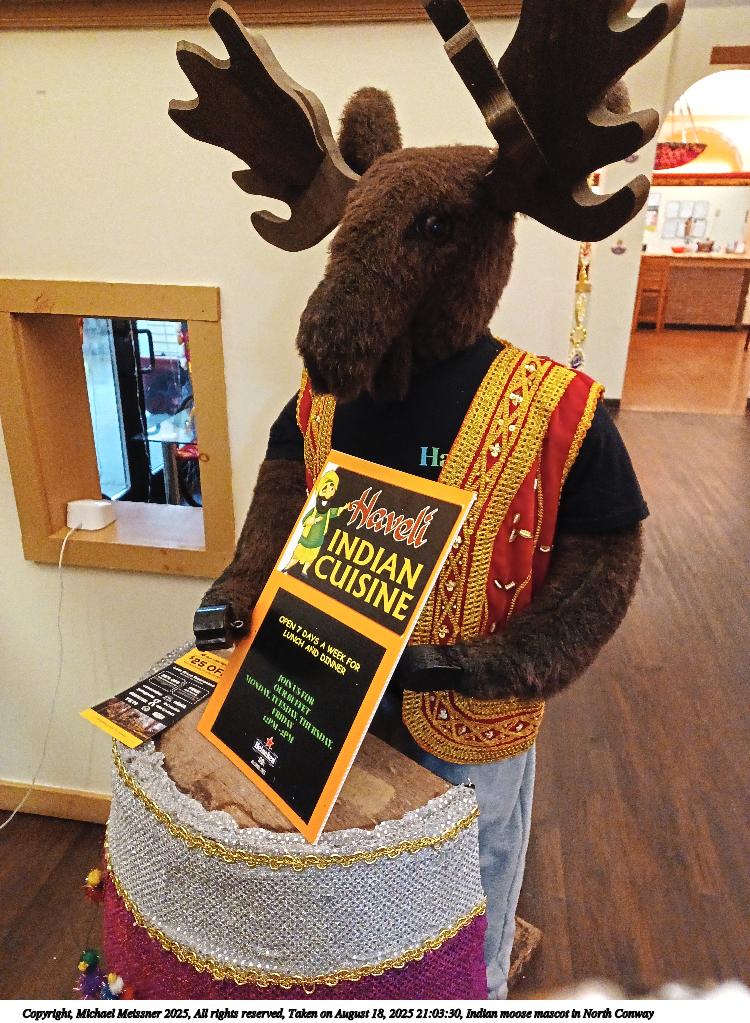 Picture #123: Indian moose mascot in North Conway 750x1023, 171,562 bytes (168K), (html file) Copyright, Michael Meissner 2025, All rights reserved Samsung A32 5G phone f/1.8, ISO 1250, 1/17 sec, 4.6mm, auto mode, center weight metering 35mm equivalent focal length 25.0mm Programs used: raw therapee, rotate right Taken by Michael Meissner on August 18, 2025 21:03:30 Last modified on August 23, 2025 at 17:12 |