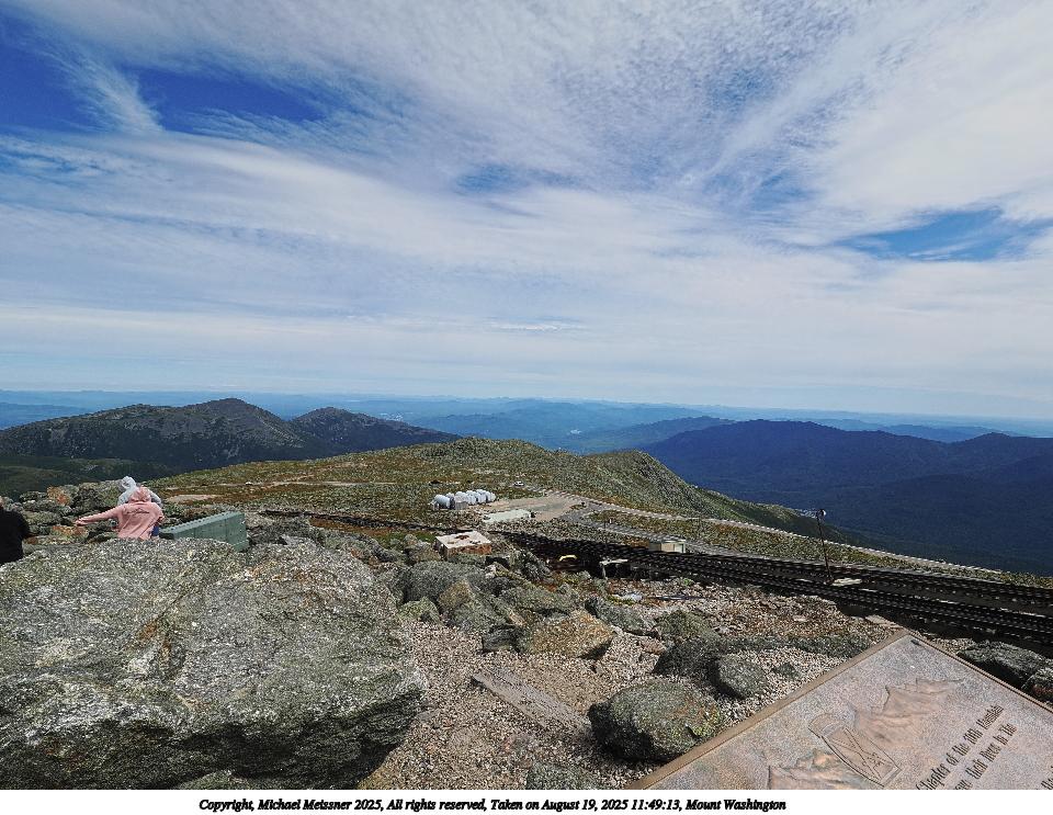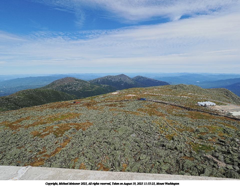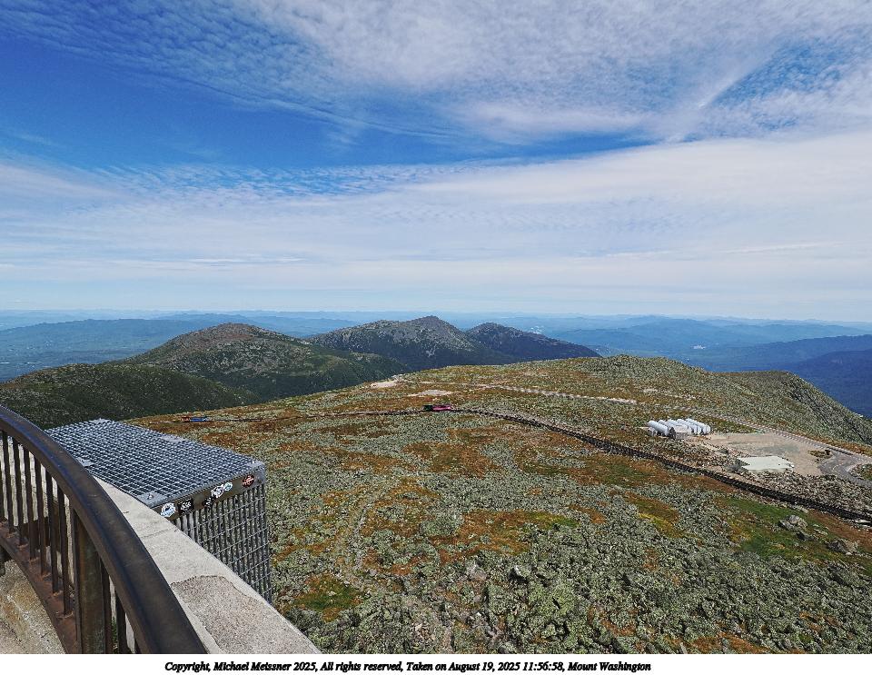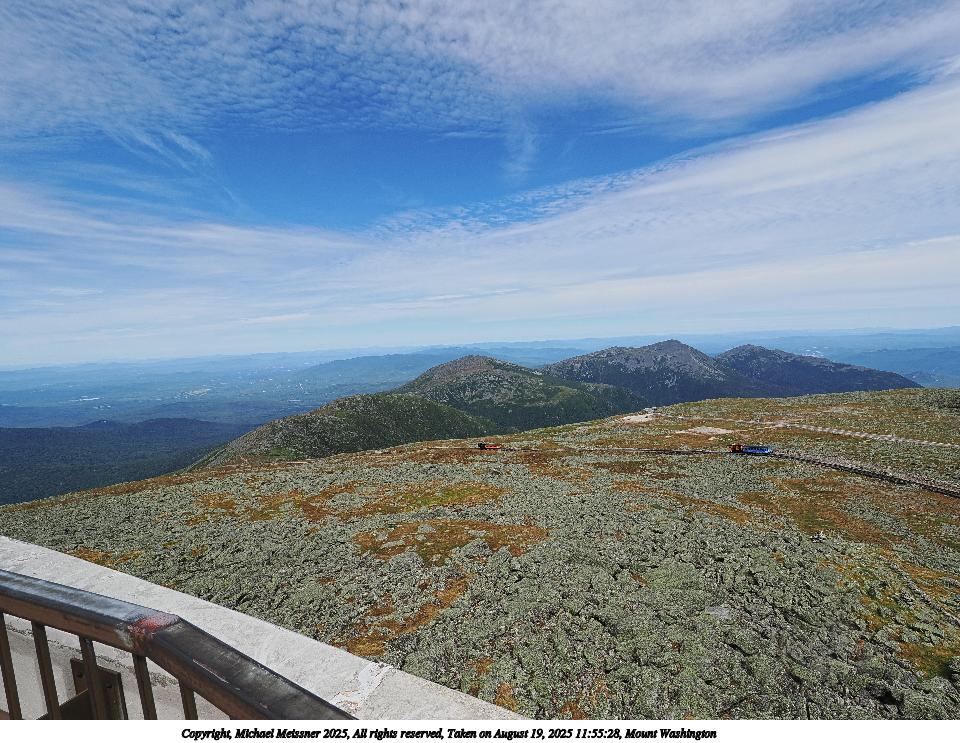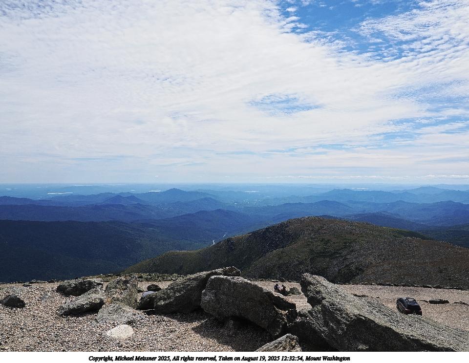 Picture #83: Mount Washington #16 960x743, 94,216 bytes (93K), (html file) Copyright, Michael Meissner 2025, All rights reserved OM OM1 camera with Olympus-m43 12-200mm f/3.5-6.3 lens f/11.0, ISO 200, 1/500 sec, 17.0mm, auto mode, vivid color, matrix metering, digital zoom x2, IS Auto 35mm equivalent focal length 68.0mm, digital zoom x2 Programs used: crop, raw therapee Taken by Michael Meissner on August 19, 2025 12:32:22 Last modified on August 23, 2025 at 17:37 This picture is one of my favorites. |
