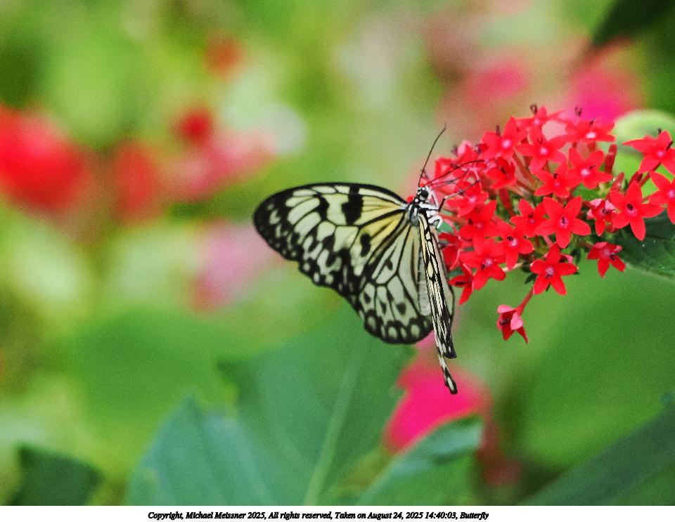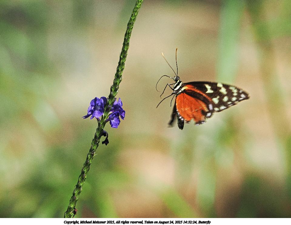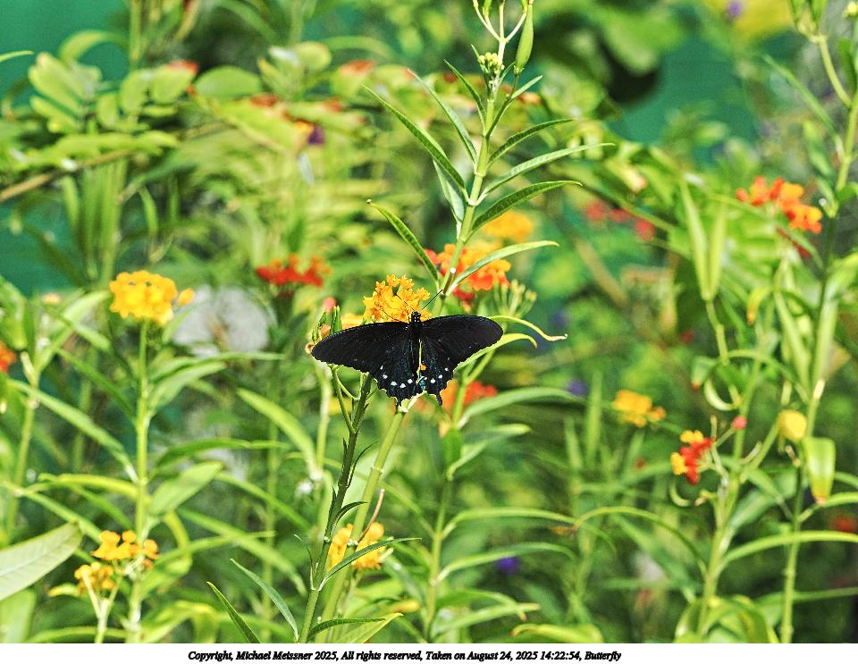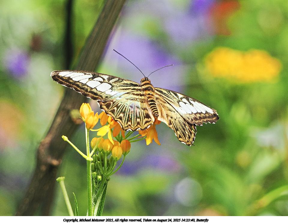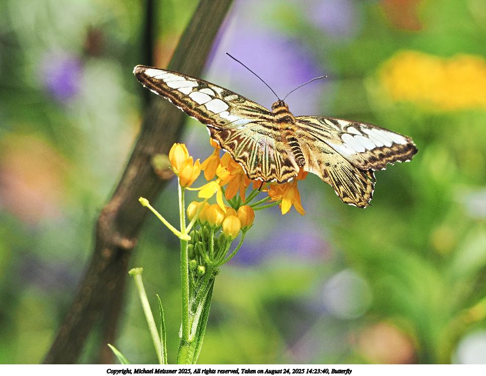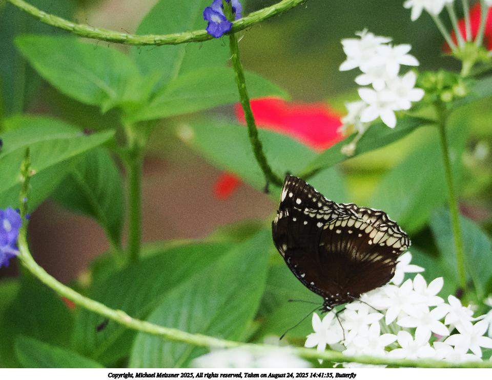 Picture #40: Butterfly #23 960x743, 111,353 bytes (109K), (html file) Copyright, Michael Meissner 2025, All rights reserved OM OM3 camera with OM 75-300mm-II f/4.8-6.7 lens f/6.3, ISO 2500, 1/500 sec, 221.0mm, auto mode, vivid color, matrix metering, IS Auto, face detection 35mm equivalent focal length 443.0mm Programs used: crop, raw therapee Taken by Michael Meissner on August 24, 2025 14:40:03 Last modified on August 26, 2025 at 00:41 |