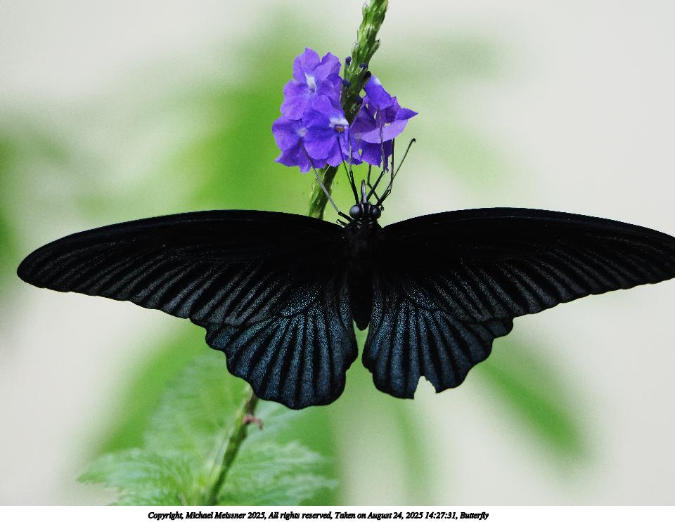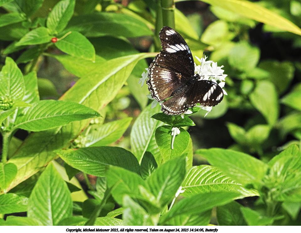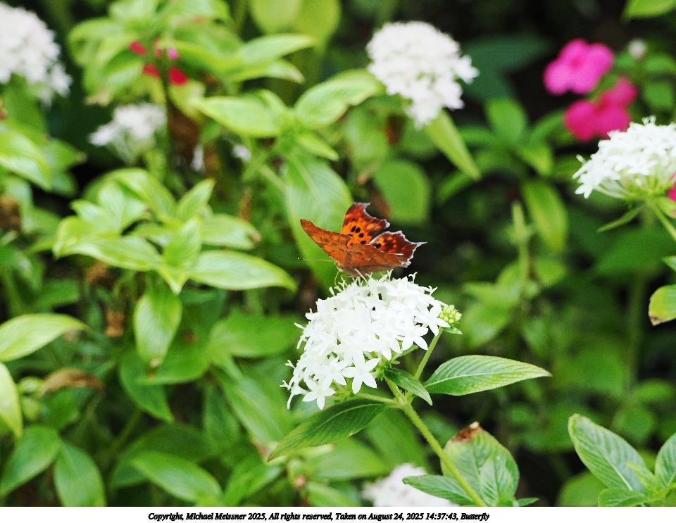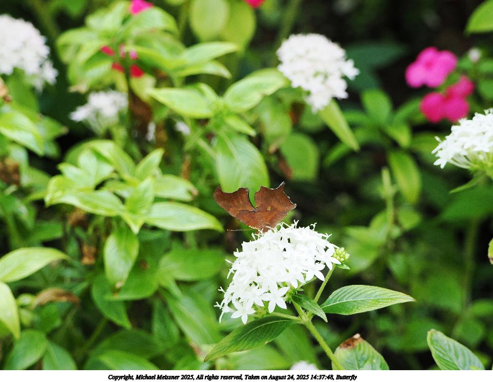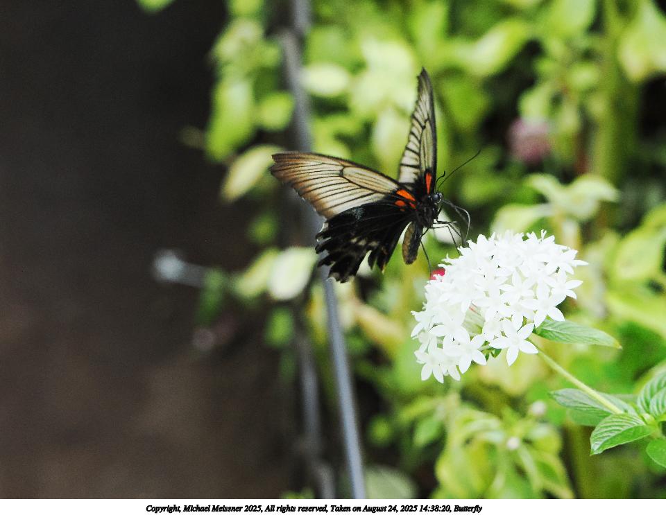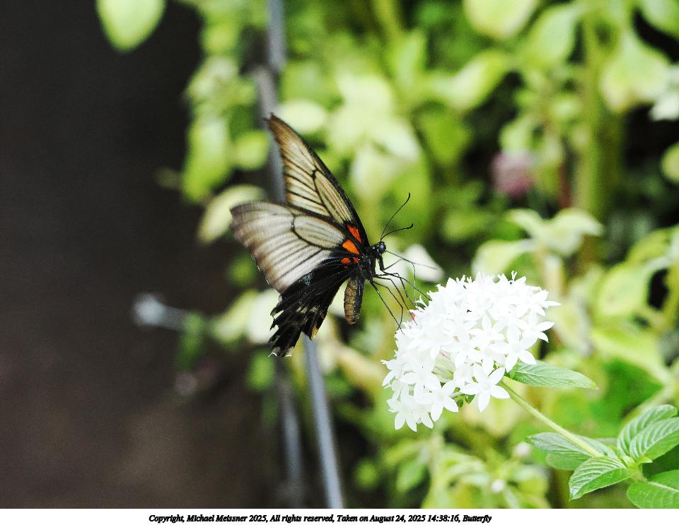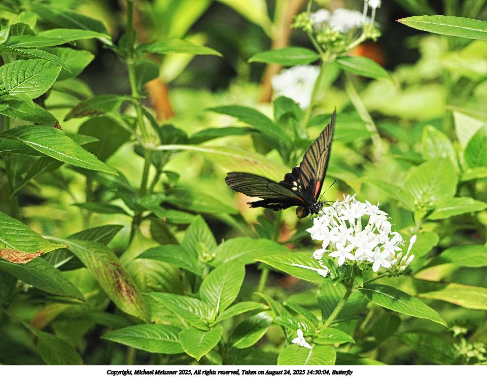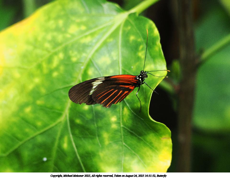 Picture #51: Butterfly #13 960x743, 97,117 bytes (95K), (html file) Copyright, Michael Meissner 2025, All rights reserved OM OM3 camera with OM 75-300mm-II f/4.8-6.7 lens f/6.3, ISO 2000, 1/500 sec, 194.0mm, auto mode, vivid color, matrix metering, IS Auto, face detection 35mm equivalent focal length 389.0mm Programs used: crop, raw therapee Taken by Michael Meissner on August 24, 2025 14:31:52 Last modified on August 26, 2025 at 00:38 |