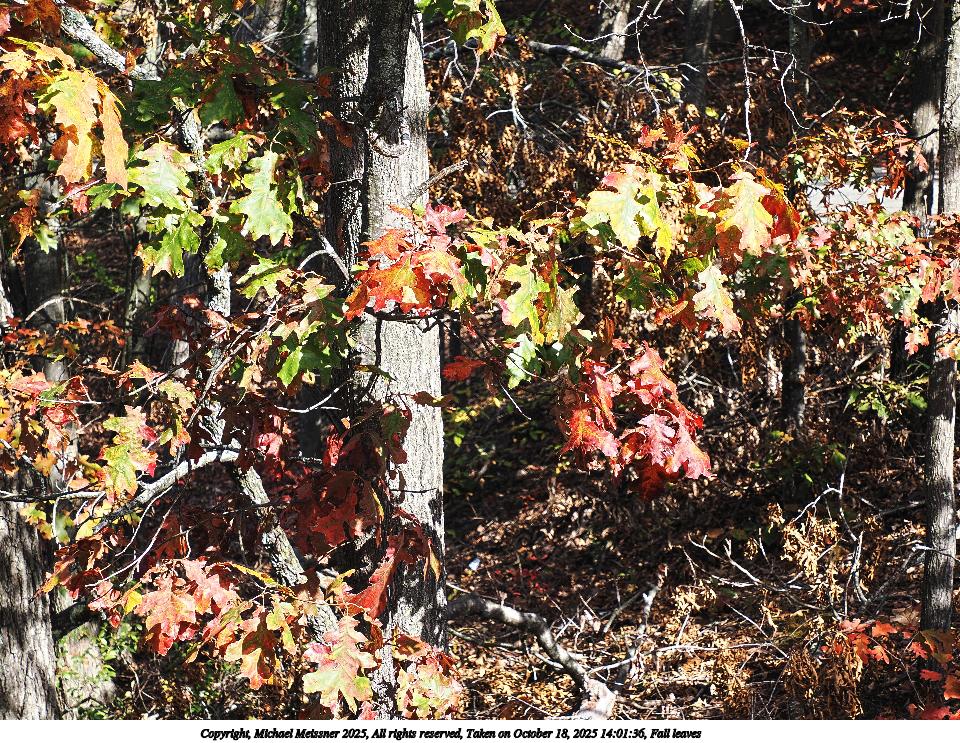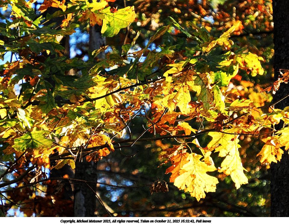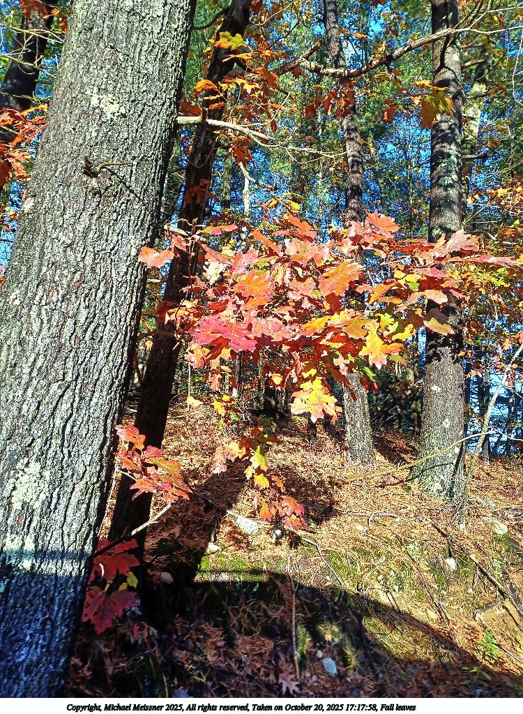 Picture #49: Fall leaves #2 960x743, 258,131 bytes (253K), (html file) Copyright, Michael Meissner 2025, All rights reserved OM OM1 camera with Olympus-m43 12-200mm f/3.5-6.3 lens f/6.3, ISO 200, 1/160 sec, 45.0mm, auto mode, vivid color, matrix metering, IS Auto, face detection, anti-shock 35mm equivalent focal length 90.0mm Taken by Michael Meissner on October 18, 2025 14:03:42 Last modified on October 18, 2025 at 22:28 This picture is one of my favorites. |