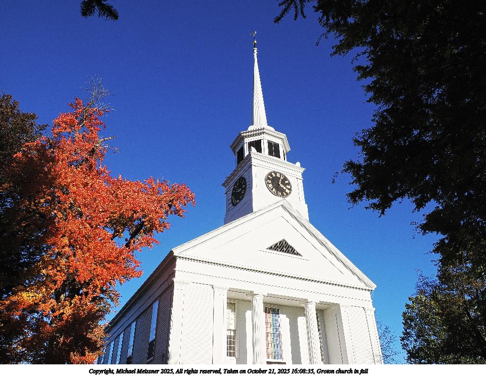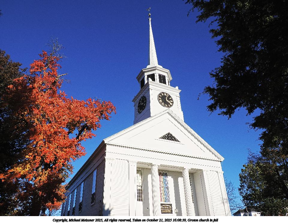 Picture #31: Groton church in fall 960x743, 197,684 bytes (194K), (html file) Copyright, Michael Meissner 2025, All rights reserved OM OM1 camera with Olympus-m43 12-200mm f/3.5-6.3 lens f/9.0, ISO 200, 1/500 sec, 12.0mm, auto mode, vivid color, matrix metering, continous focus, IS Auto 35mm equivalent focal length 24.0mm Programs used: crop, raw therapee Taken by Michael Meissner on October 21, 2025 16:08:35 Last modified on October 23, 2025 at 01:28 This picture is one of my favorites. |