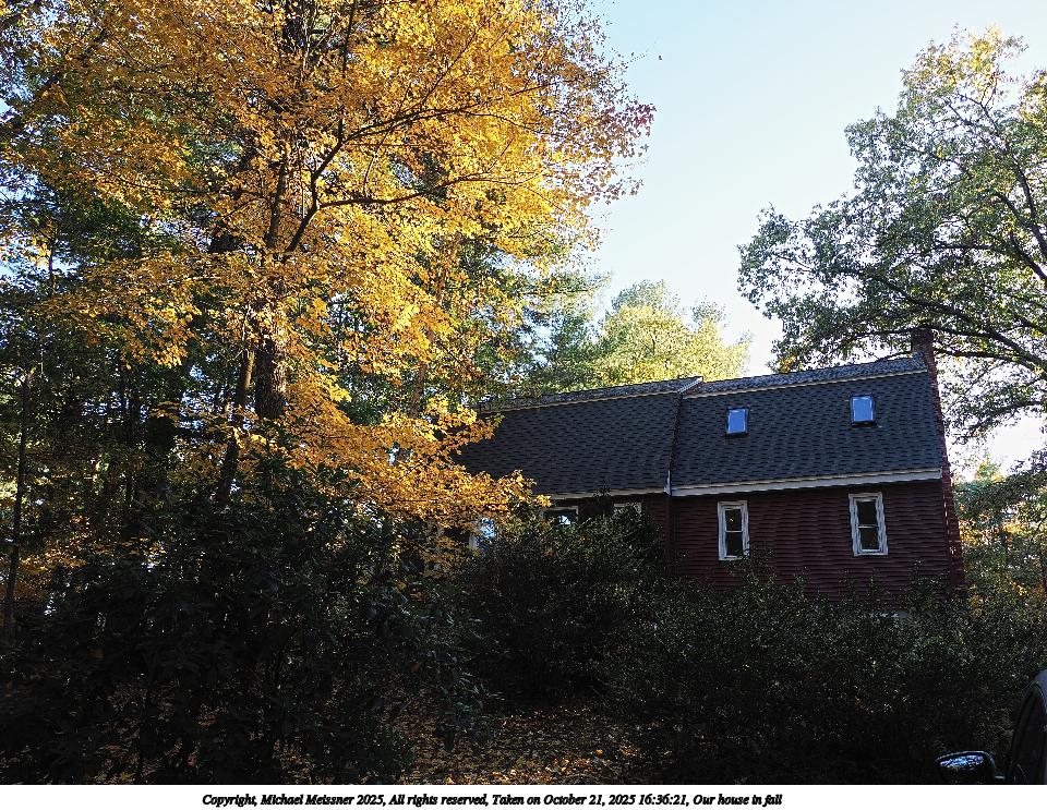 Picture #21: Our house in fall #2 960x743, 289,167 bytes (283K), (html file) Copyright, Michael Meissner 2025, All rights reserved OM OM1 camera with Olympus-m43 12-200mm f/3.5-6.3 lens f/4.5, ISO 200, 1/125 sec, 12.0mm, auto mode, vivid color, matrix metering, continous focus, IS Auto, anti-shock 35mm equivalent focal length 24.0mm Programs used: crop, raw therapee Taken by Michael Meissner on October 21, 2025 16:36:21 Last modified on October 23, 2025 at 01:40 |