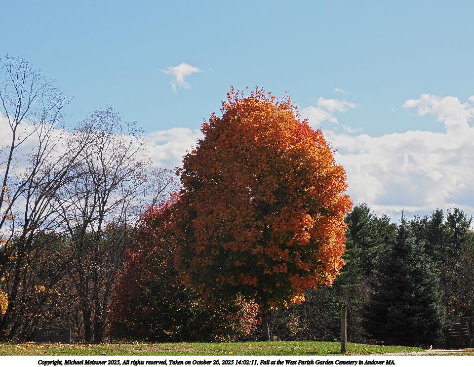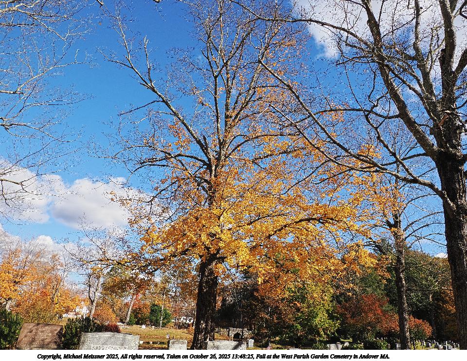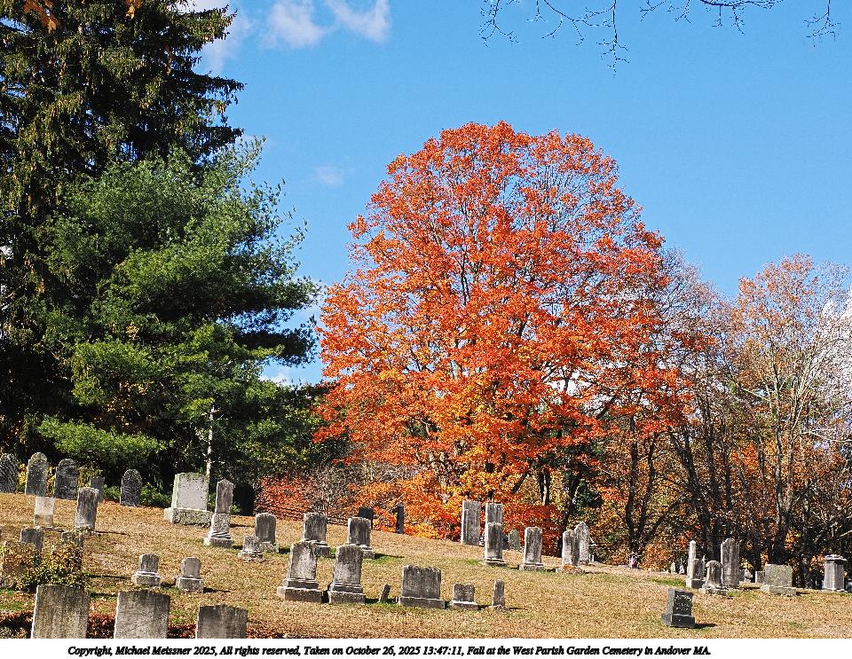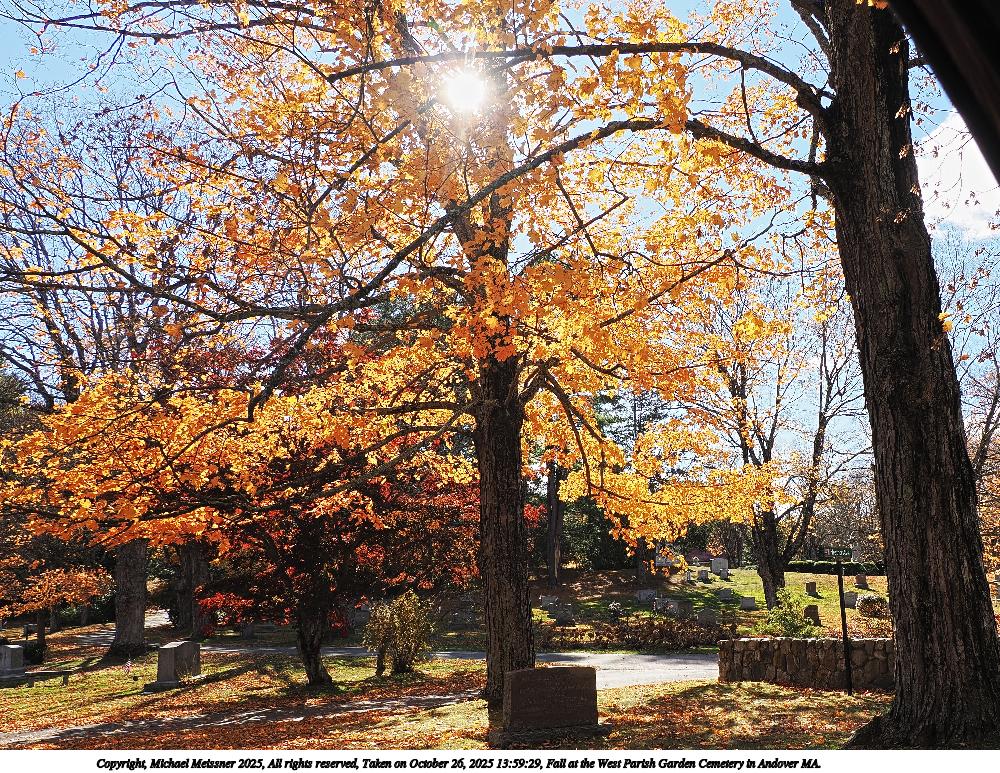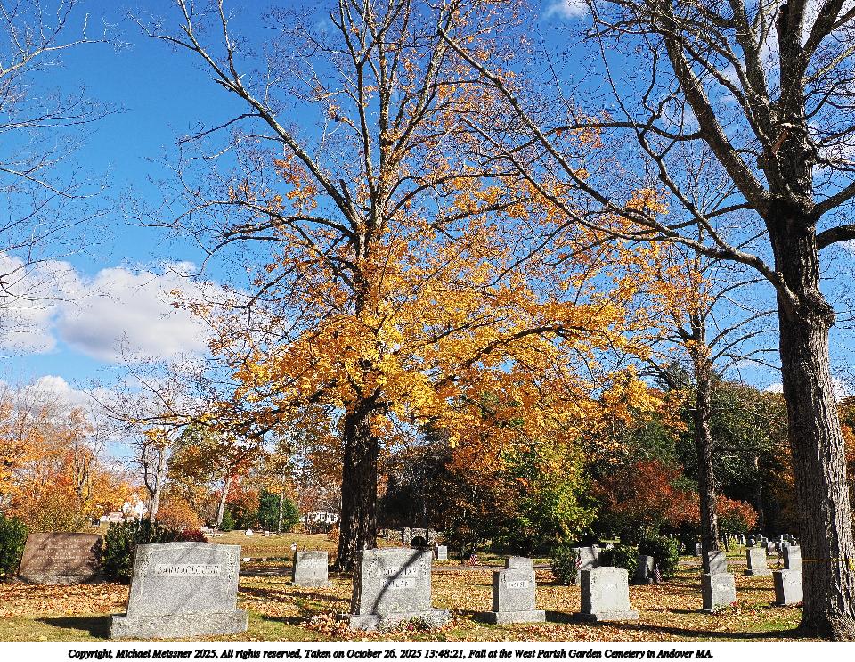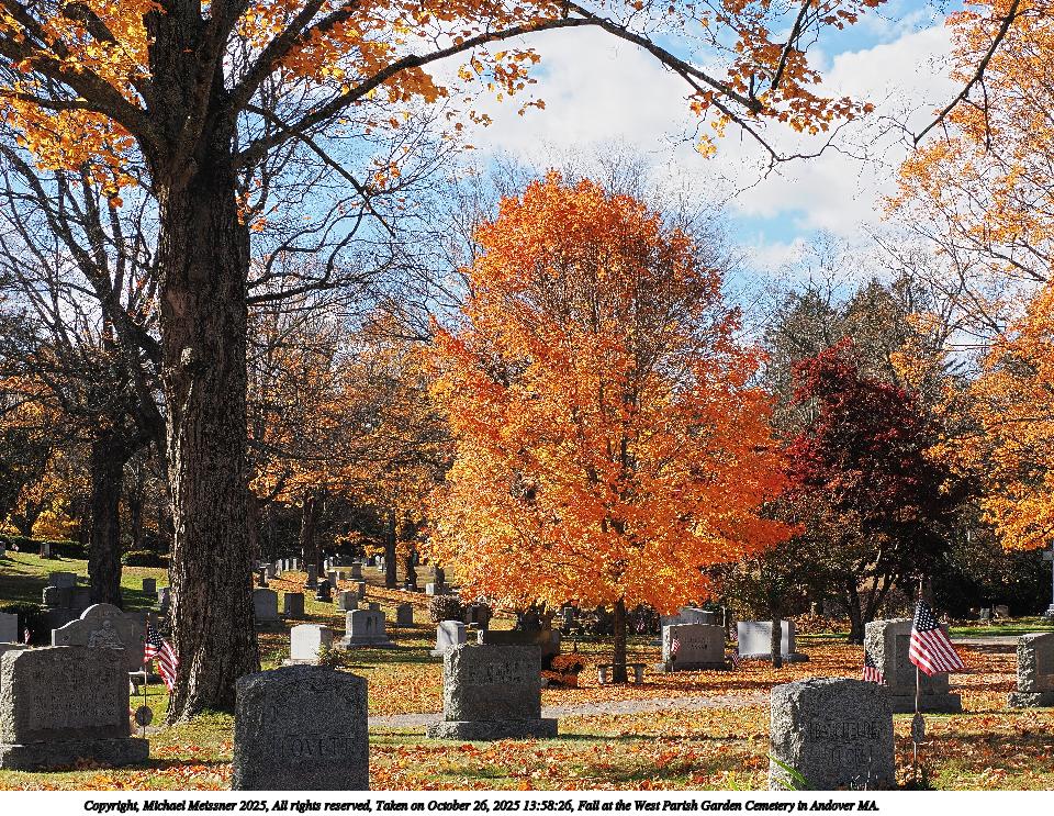 Picture #14: Fall at the West Parish Garden Cemetery in Andover MA. #7 960x743, 376,852 bytes (369K), (html file) Copyright, Michael Meissner 2025, All rights reserved OM OM1 camera with Olympus-m43 12-200mm f/3.5-6.3 lens f/9.0, ISO 200, 1/250 sec, 17.0mm, auto mode, vivid color, matrix metering, continous focus, IS Auto, anti-shock 35mm equivalent focal length 34.0mm Programs used: crop, raw therapee Taken by Michael Meissner on October 26, 2025 13:50:43 Last modified on October 26, 2025 at 20:41 |