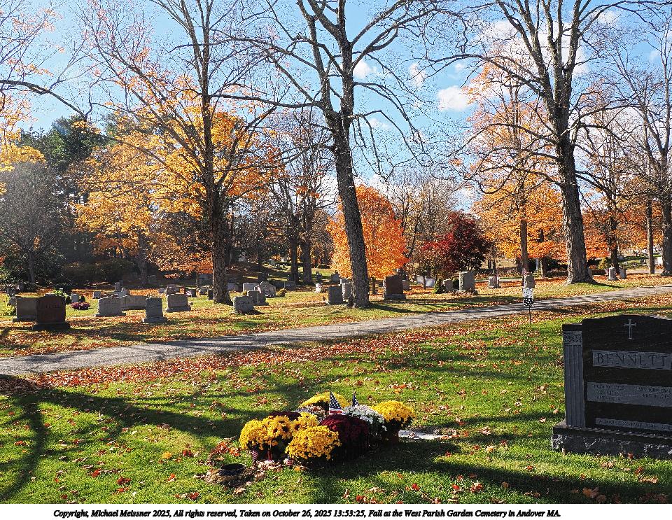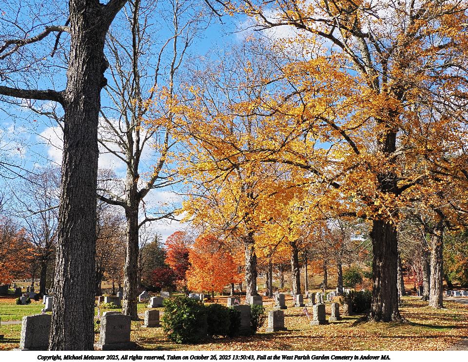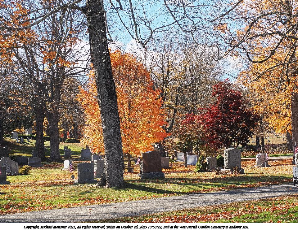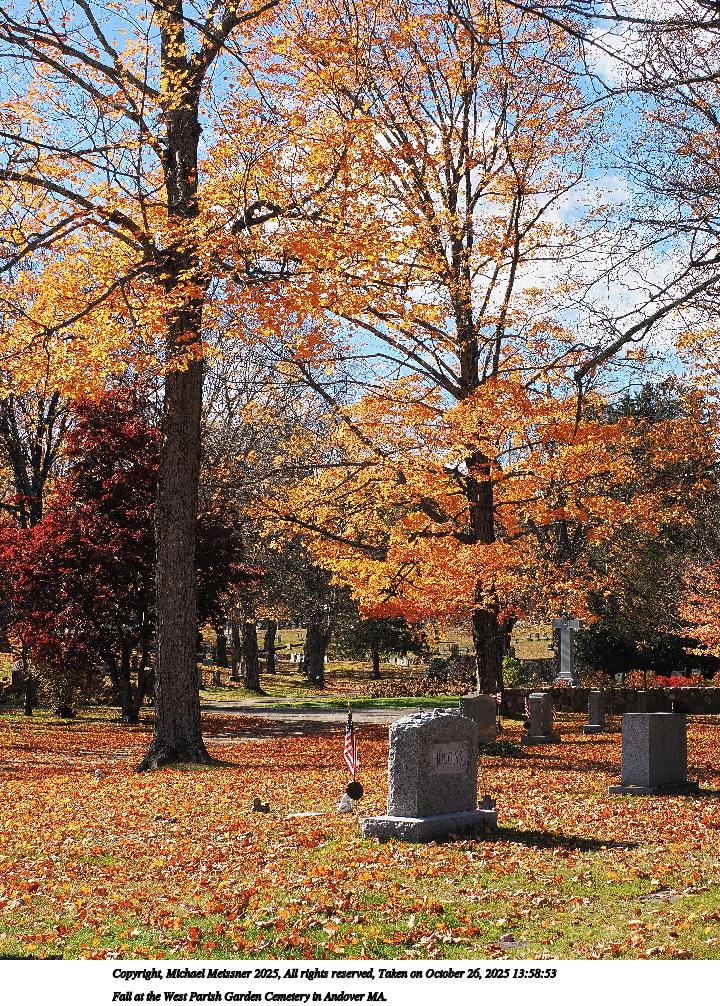 Picture #19: Fall at the West Parish Garden Cemetery in Andover MA. #2 960x743, 241,887 bytes (237K), (html file) Copyright, Michael Meissner 2025, All rights reserved OM OM1 camera with Olympus-m43 12-200mm f/3.5-6.3 lens f/8.0, ISO 200, 1/200 sec, 25.0mm, auto mode, vivid color, matrix metering, continous focus, IS Auto, anti-shock 35mm equivalent focal length 50.0mm Programs used: crop, raw therapee Taken by Michael Meissner on October 26, 2025 13:39:53 Last modified on October 26, 2025 at 20:39 |
