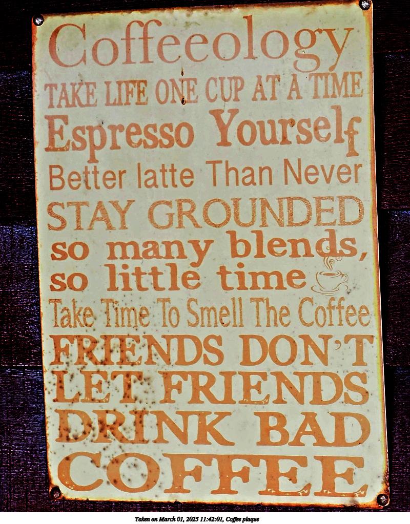 Picture #14: Coffee plaque Thumb: 400x500, 69,822 bytes (69K) Small: 800x1023, 181,742 bytes (178K), (html file) Olympus E-M5-III camera with Olympus-m43 12-40mm f/2.8 lens f/3.5, ISO 200, 1/125 sec, 40.0mm, auto mode, vivid color, SHQ, matrix metering, bias 0.3, continous focus, IS Auto, anti-shock 35mm equivalent focal length 80.0mm Programs used: crop, gimp, raw therapee, rotate left Taken by Michael Meissner on March 01, 2025 11:42:01 Last modified on March 17, 2025 at 01:12 |