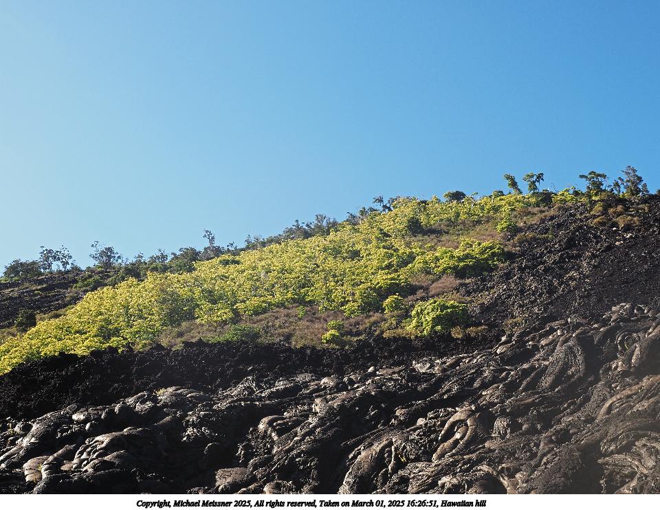 Picture #28: Hawaiian hill Thumb: 480x360, 56,768 bytes (56K) Small: 960x743, 190,261 bytes (186K), (html file) Copyright, Michael Meissner 2025, All rights reserved Olympus E-M5-III camera with Olympus-m43 12-40mm f/2.8 lens f/6.3, ISO 200, 1/320 sec, 20.0mm, auto mode, vivid color, SHQ, matrix metering, continous focus, IS Auto 35mm equivalent focal length 40.0mm Programs used: crop, raw therapee Taken by Michael Meissner on March 01, 2025 16:26:51 Last modified on March 20, 2025 at 23:07 |