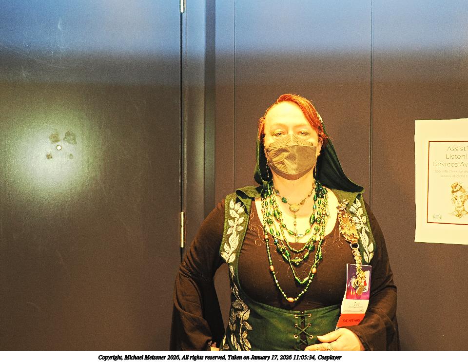 Picture #14: Cosplayer #4 Thumb: 480x360, 43,871 bytes (43K) Small: 960x743, 142,065 bytes (139K), (html file) Large: 4800x3600, 4,033,177 bytes (3.8M), (html file) Copyright, Michael Meissner 2026, All rights reserved Olympus E-M1-II camera with Olympus-m43 17mm f/1.2 lens f/1.6, ISO 200, 1/100 sec, 17.0mm, auto mode, natural color, SHQ, matrix metering, continous focus, IS Auto, noise reduction auto, both eyes priority, face detection 35mm equivalent focal length 34.0mm Programs used: crop, raw therapee Taken by Michael Meissner on January 18, 2026 13:31:42 Last modified on January 25, 2026 at 03:11 |