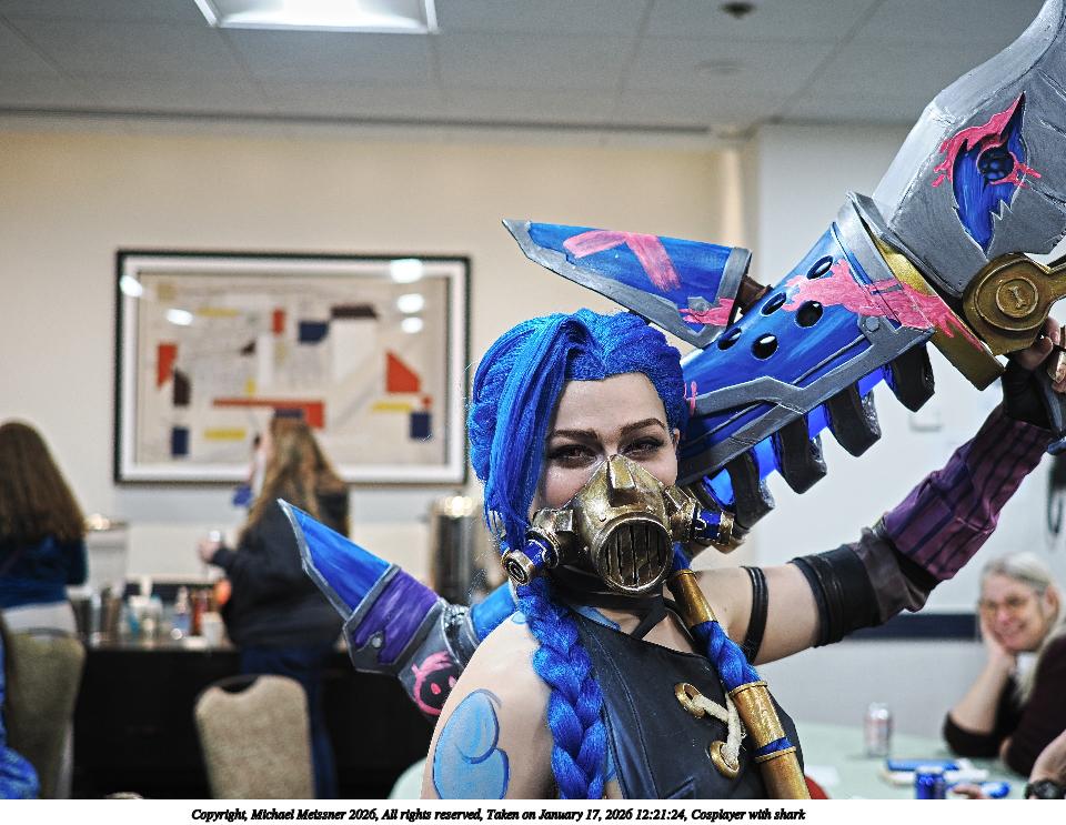 Picture #8: Cosplayer with shark Thumb: 480x360, 56,104 bytes (55K) Small: 960x743, 138,804 bytes (136K), (html file) Large: 4800x3600, 3,877,267 bytes (3.7M), (html file) Copyright, Michael Meissner 2026, All rights reserved OM OM3 camera with OM 20mm f/1.4 lens f/1.6, ISO 200, flash, 1/80 sec, 20.0mm, auto mode, vivid color, matrix metering, IS Auto, face detection, anti-shock 35mm equivalent focal length 40.0mm Programs used: crop, raw therapee Taken by Michael Meissner on January 17, 2026 12:21:24 Last modified on January 25, 2026 at 02:22 |