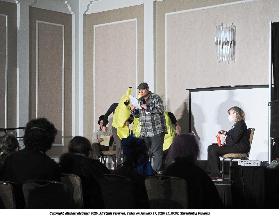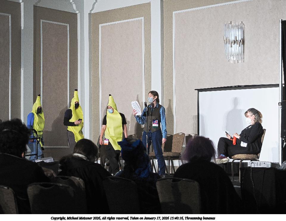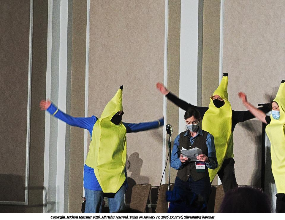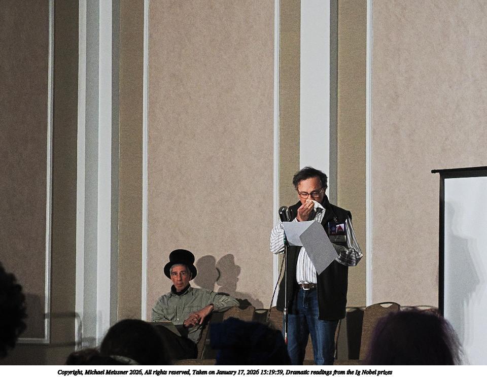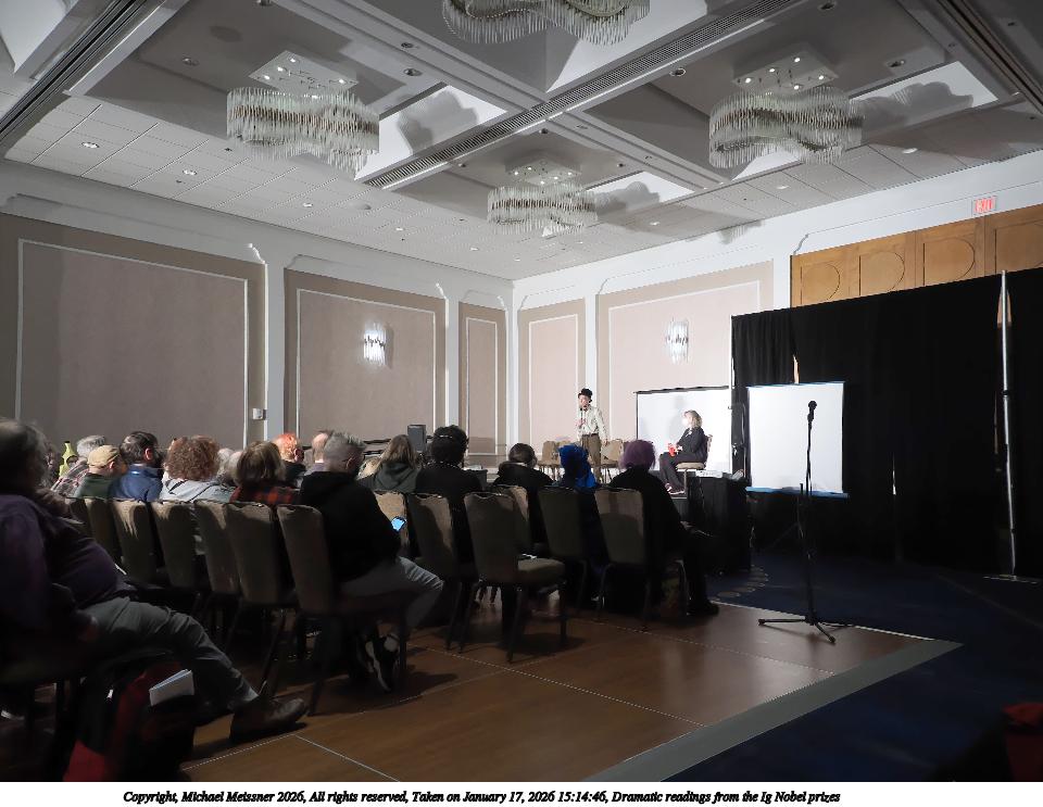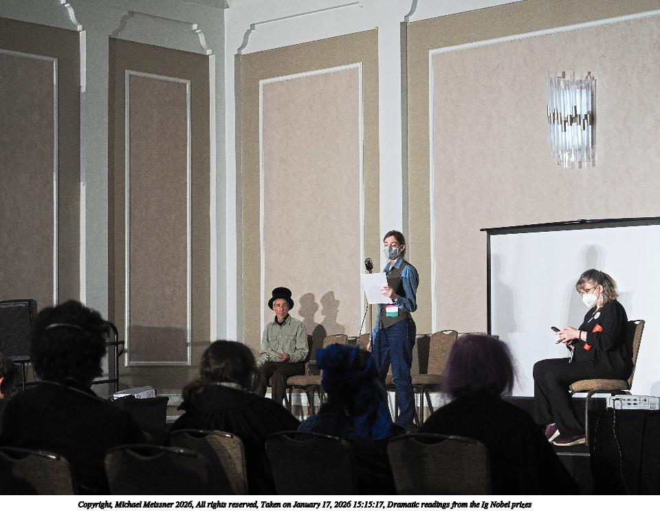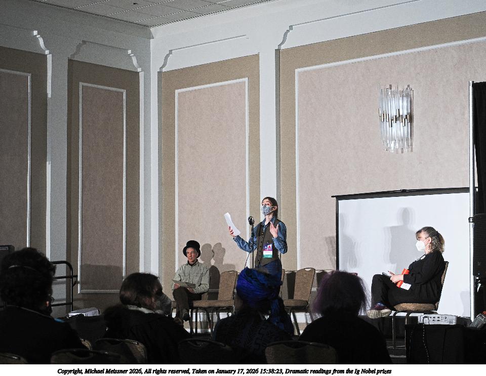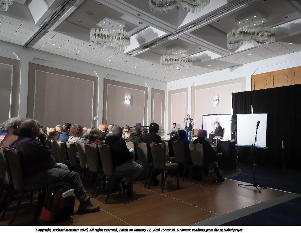Picture #9: Dramatic readings from the Ig Nobel prizes #6 Thumb: 480x360, 48,966 bytes (48K) Small: 960x743, 113,750 bytes (112K), (html file) Large: 4800x3600, 5,140,773 bytes (4.9M), (html file) Copyright, Michael Meissner 2026, All rights reserved OM OM1 camera with Olympus-m43 12-40mm f/2.8 lens f/2.8, ISO 4000, 1/125 sec, 12.0mm, auto mode, vivid color, matrix metering, IS Auto, face detection, anti-shock 35mm equivalent focal length 24.0mm Programs used: crop, gimp, raw therapee Taken by Michael Meissner on January 17, 2026 15:20:39 Last modified on January 25, 2026 at 02:37 |