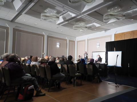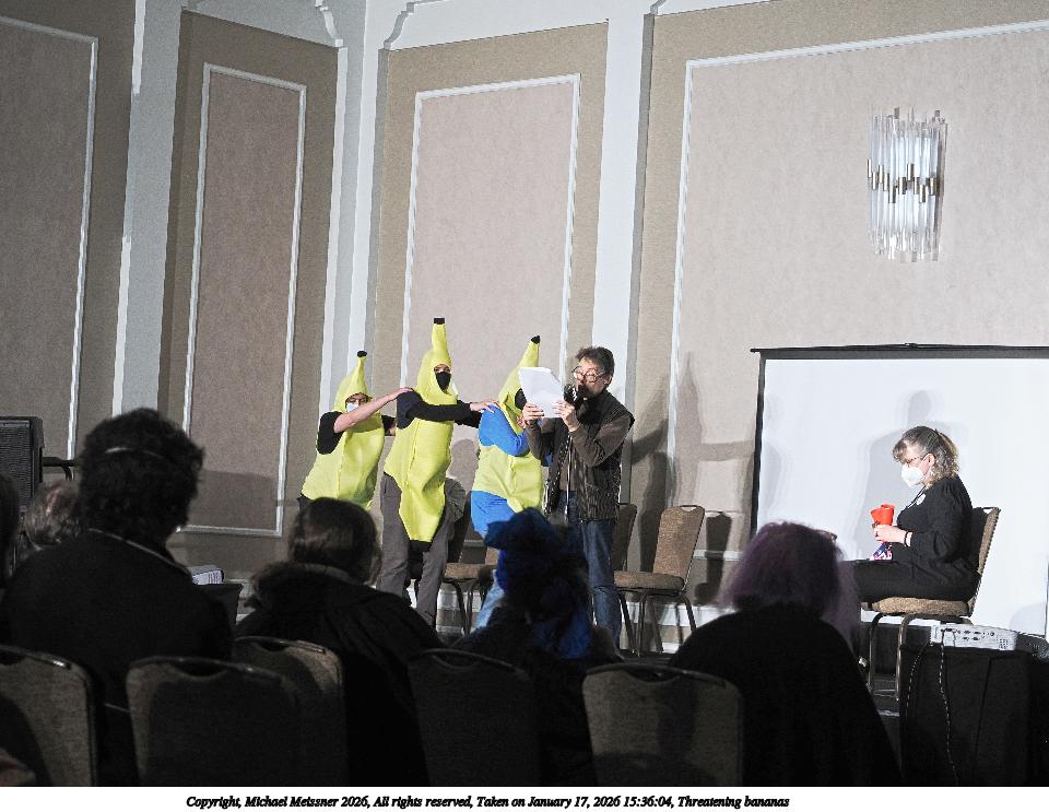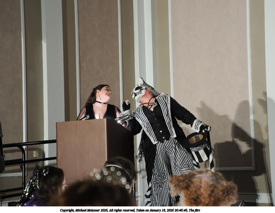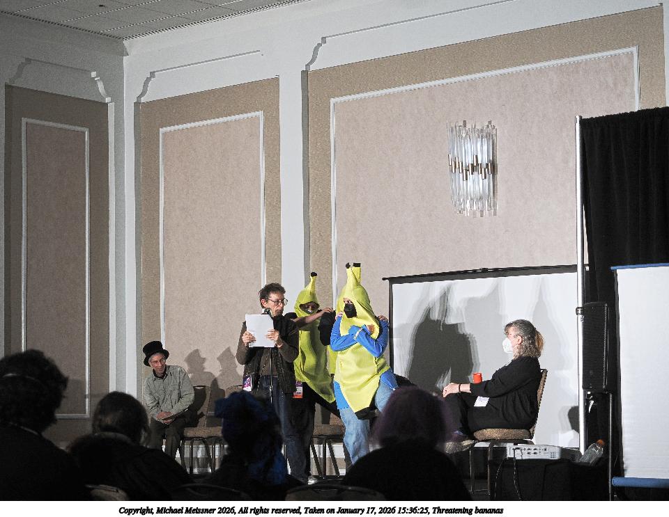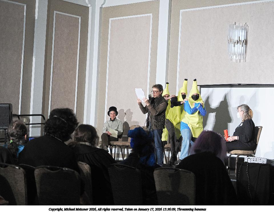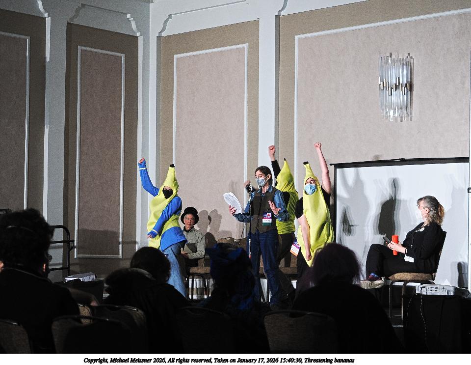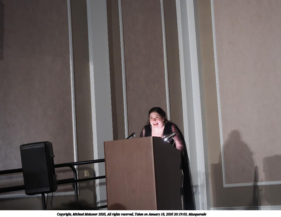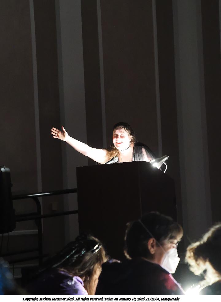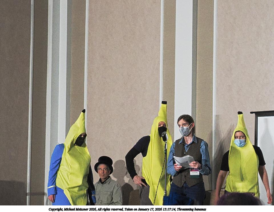 Picture #9: Dramatic readings from the Ig Nobel prizes #6 Thumb: 480x360, 48,966 bytes (48K) Small: 960x743, 113,750 bytes (112K), (html file) Large: 4800x3600, 5,140,773 bytes (4.9M), (html file) Copyright, Michael Meissner 2026, All rights reserved OM OM1 camera with Olympus-m43 12-40mm f/2.8 lens f/2.8, ISO 4000, 1/125 sec, 12.0mm, auto mode, vivid color, matrix metering, IS Auto, face detection, anti-shock 35mm equivalent focal length 24.0mm Programs used: crop, gimp, raw therapee Taken by Michael Meissner on January 17, 2026 15:20:39 Last modified on January 25, 2026 at 02:37 |