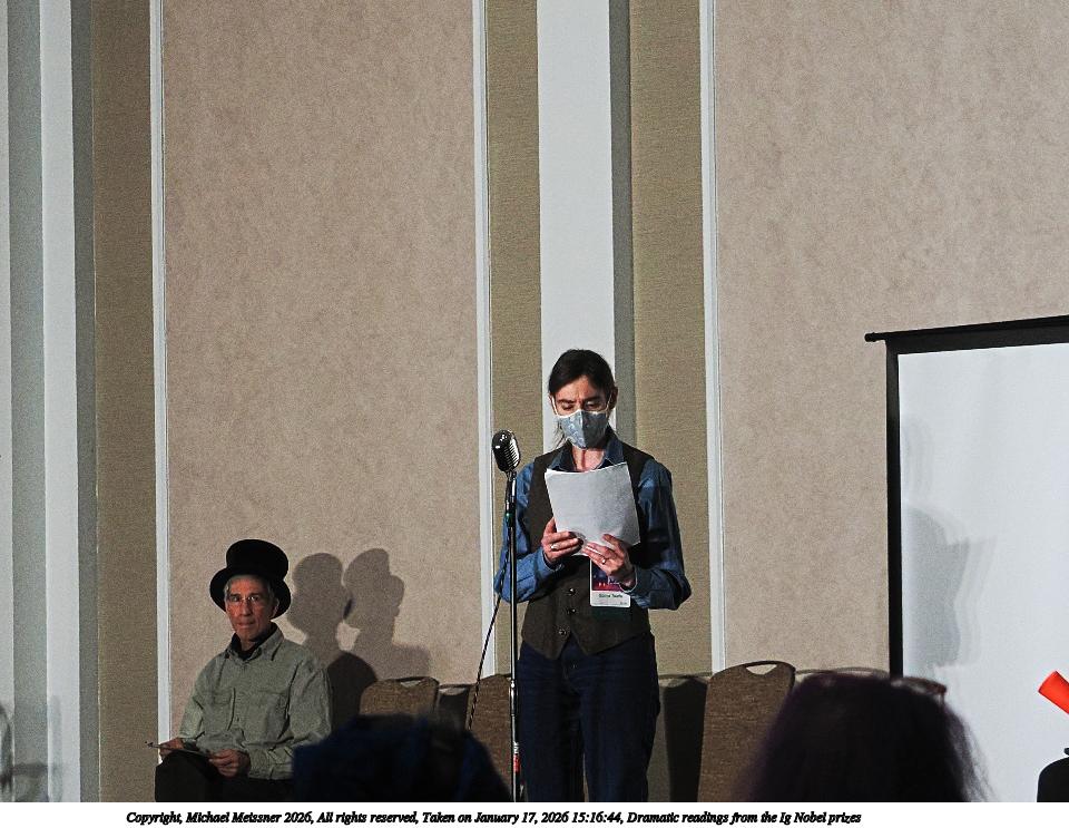 Picture #2: Dramatic readings from the Ig Nobel prizes #2 Thumb: 480x360, 46,202 bytes (46K) Small: 960x743, 121,819 bytes (119K), (html file) Large: 4800x3600, 9,146,648 bytes (8.7M), (html file) Copyright, Michael Meissner 2026, All rights reserved OM OM1 camera with Olympus-m43 12-40mm f/2.8 lens f/2.8, ISO 1600, 1/125 sec, 40.0mm, auto mode, vivid color, matrix metering, IS Auto, face detection, anti-shock 35mm equivalent focal length 80.0mm Programs used: crop, gimp, raw therapee Taken by Michael Meissner on January 17, 2026 15:15:17 Last modified on January 25, 2026 at 02:32 |