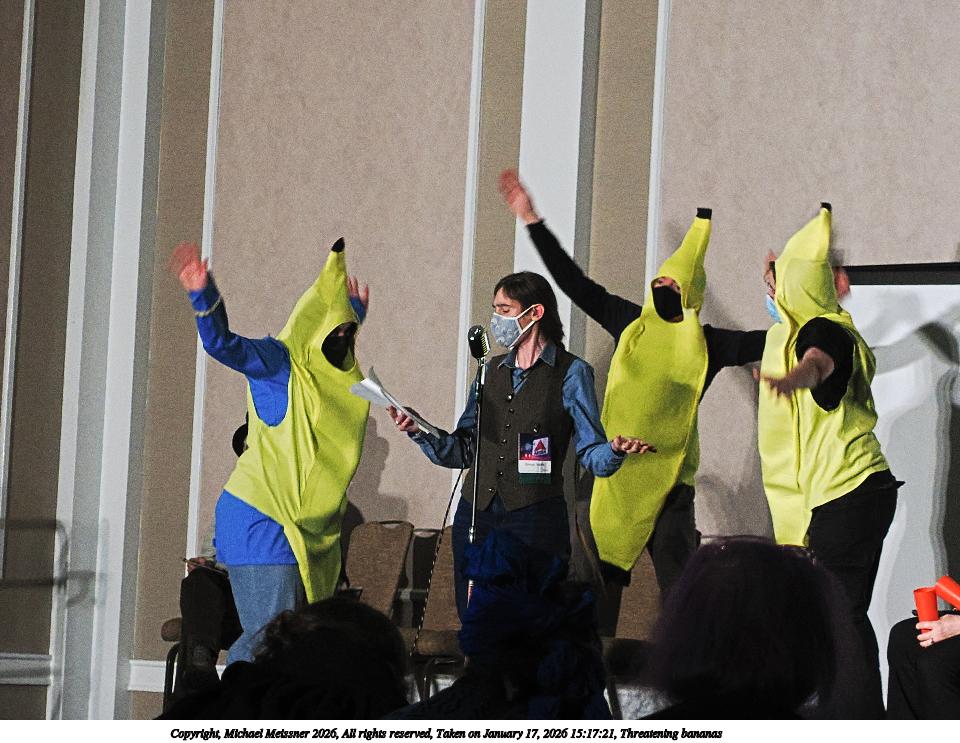 Picture #6: Threatening bananas #3 Thumb: 480x360, 51,661 bytes (51K) Small: 960x743, 133,812 bytes (131K), (html file) Large: 4800x3600, 4,381,994 bytes (4.2M), (html file) Copyright, Michael Meissner 2026, All rights reserved OM OM1 camera with Olympus-m43 12-40mm f/2.8 lens f/2.8, ISO 1600, 1/125 sec, 36.0mm, auto mode, vivid color, matrix metering, digital zoom x2, IS Auto, face detection, anti-shock 35mm equivalent focal length 144.0mm, digital zoom x2 Programs used: crop, raw therapee Taken by Michael Meissner on January 17, 2026 15:17:21 Last modified on January 25, 2026 at 02:35 |