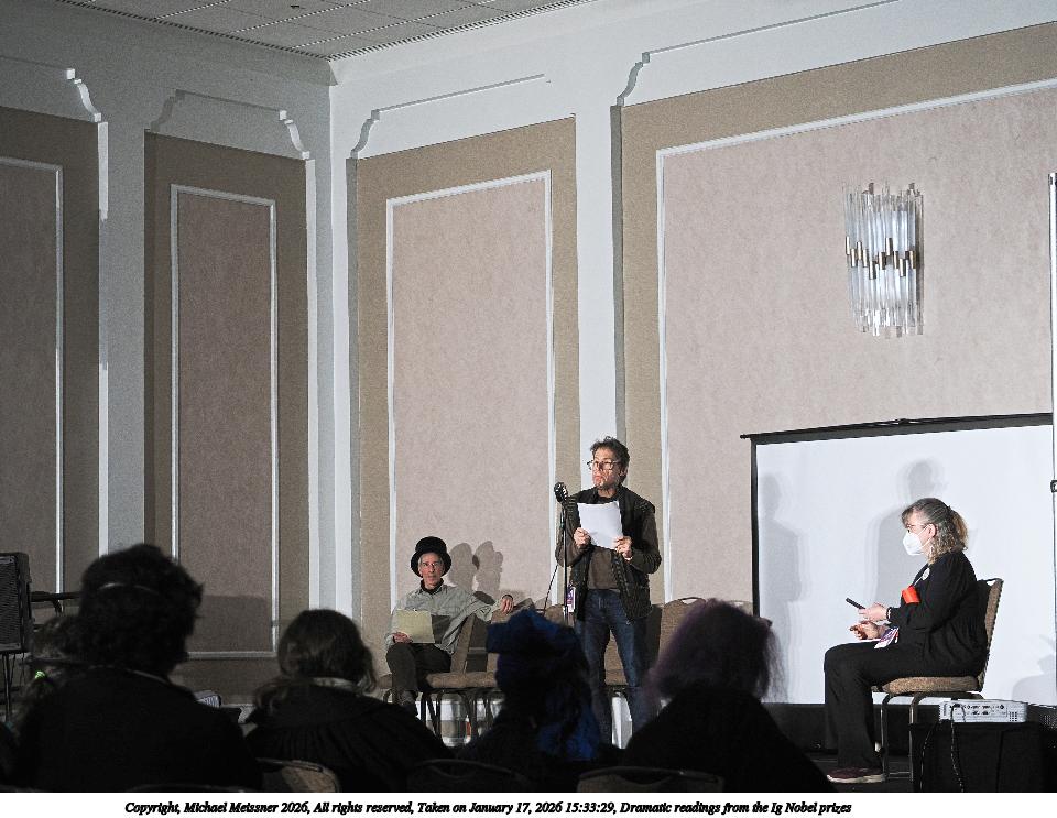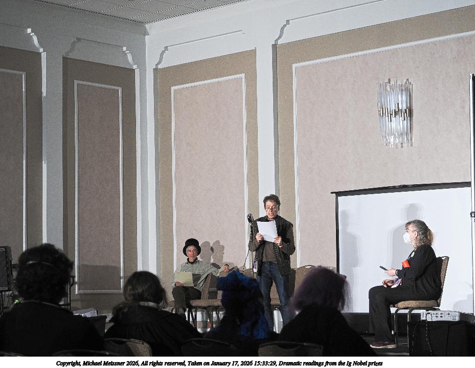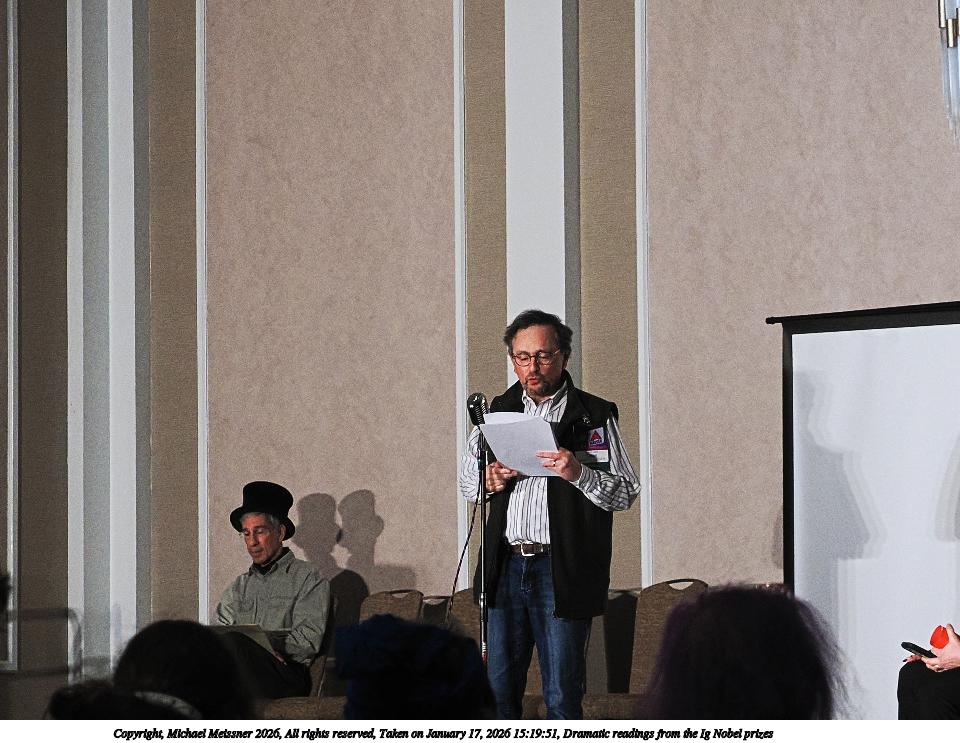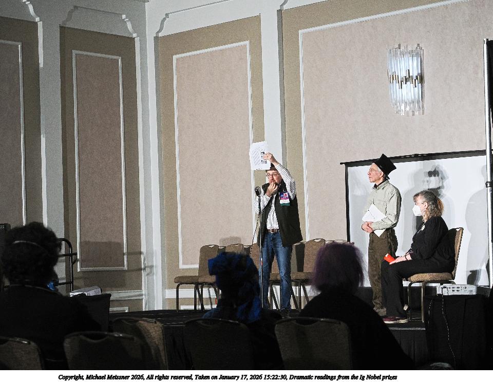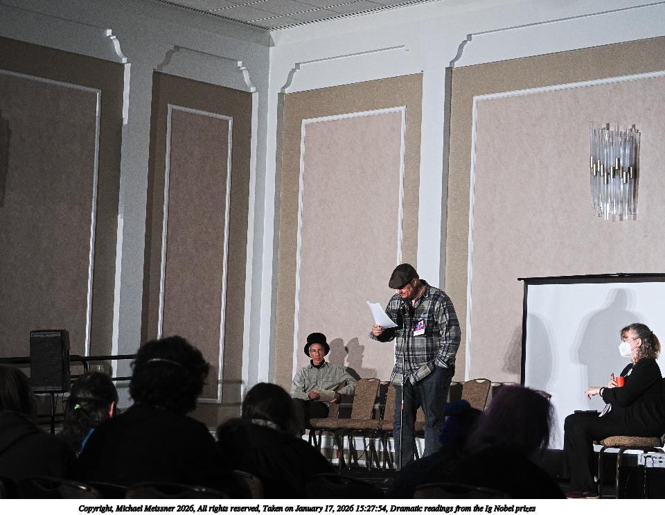 Picture #25: Dramatic readings from the Ig Nobel prizes #13 Thumb: 480x360, 44,826 bytes (44K) Small: 960x743, 122,328 bytes (120K), (html file) Large: 4800x3600, 9,748,073 bytes (9.3M), (html file) Copyright, Michael Meissner 2026, All rights reserved OM OM1 camera with Olympus-m43 12-40mm f/2.8 lens f/2.8, ISO 800, 1/125 sec, 40.0mm, auto mode, vivid color, matrix metering, digital zoom x2, IS Auto, face detection, anti-shock 35mm equivalent focal length 160.0mm, digital zoom x2 Programs used: crop, gimp, raw therapee Taken by Michael Meissner on January 17, 2026 15:44:29 Last modified on January 25, 2026 at 03:07 |