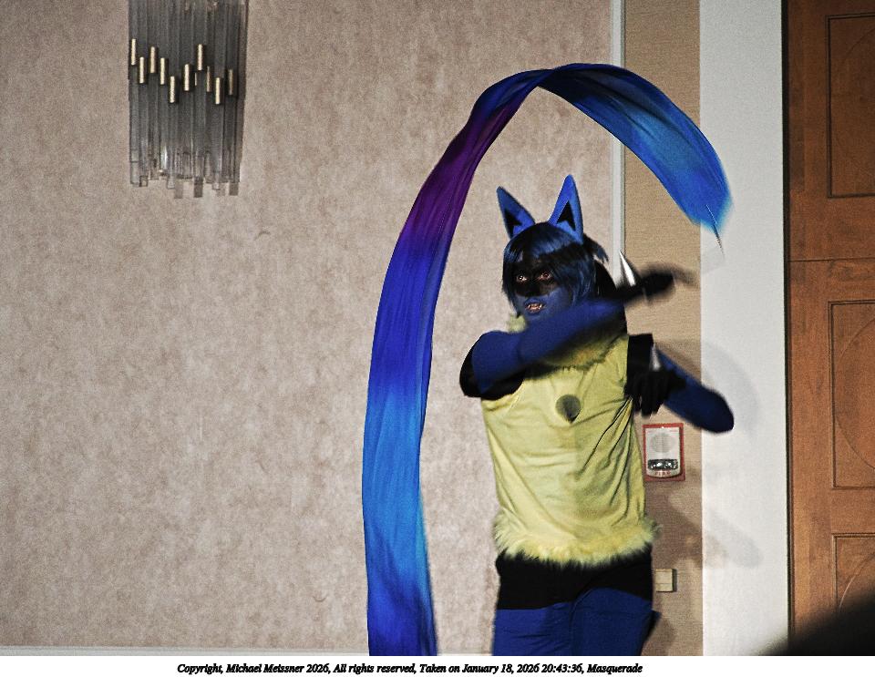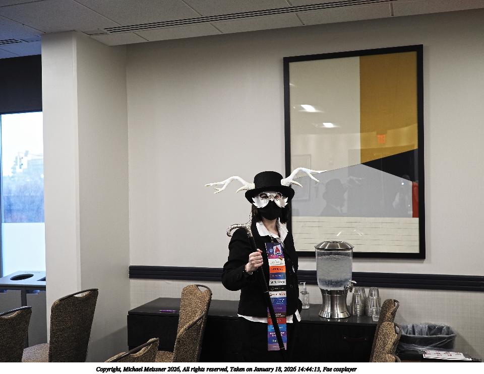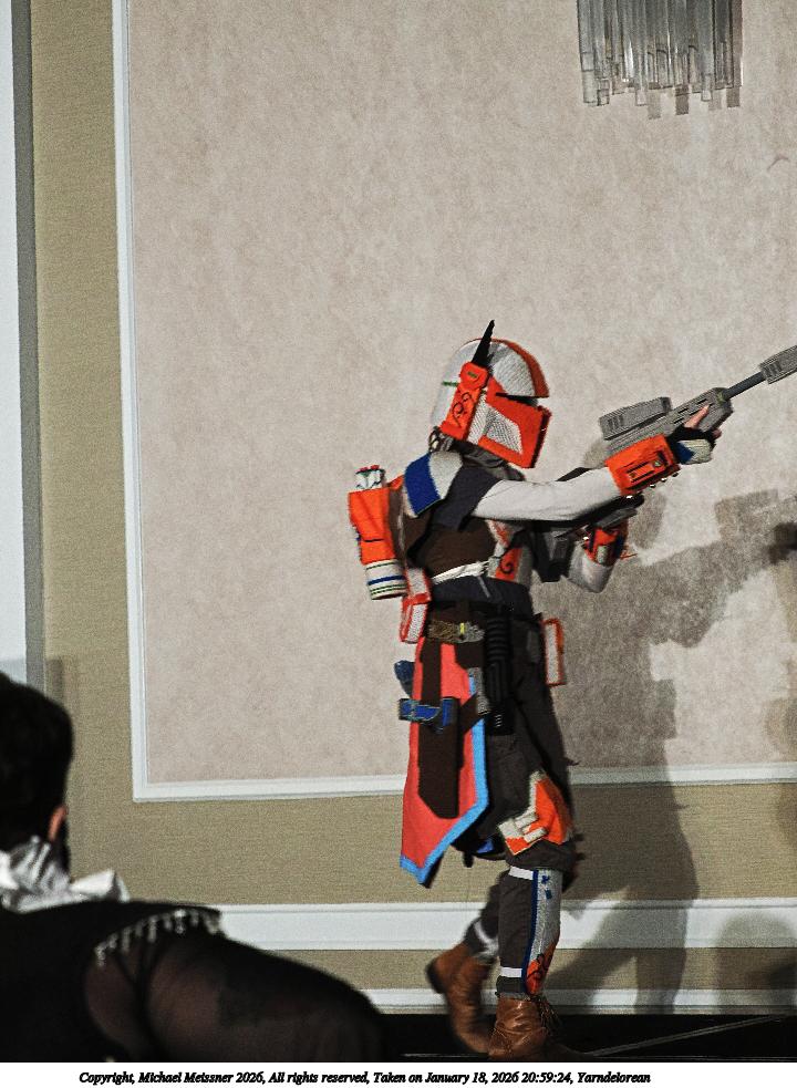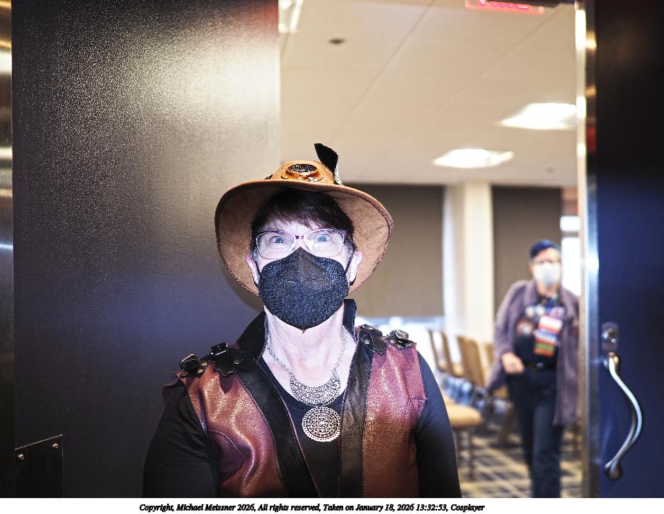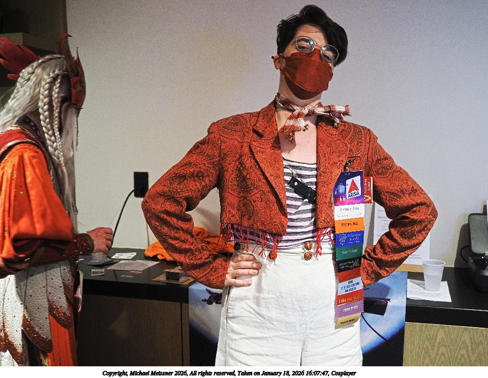 Picture #2: Cosplayer Thumb: 480x360, 44,177 bytes (44K) Small: 960x743, 101,948 bytes (100K), (html file) Large: 4800x3600, 3,246,214 bytes (3.1M), (html file) Copyright, Michael Meissner 2026, All rights reserved OM OM3 camera with OM 20mm f/1.4 lens f/1.8, ISO 200, flash, 1/100 sec, 20.0mm, auto mode, vivid color, matrix metering, IS Auto, face detection, anti-shock 35mm equivalent focal length 40.0mm Programs used: crop, raw therapee Taken by Michael Meissner on January 17, 2026 11:04:00 Last modified on January 25, 2026 at 02:15 |