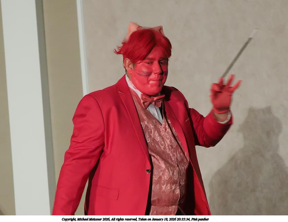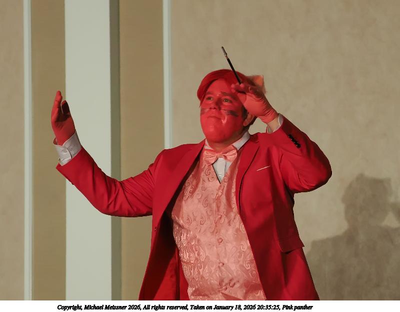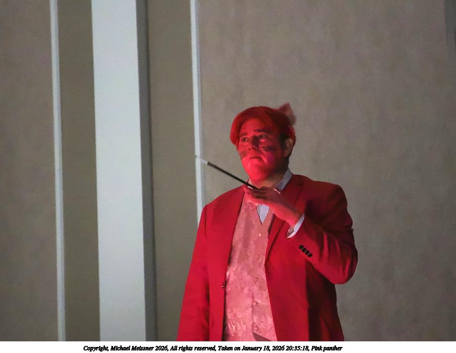 Picture #12: Pink panther Thumb: 400x300, 34,474 bytes (34K) Small: 900x698, 71,385 bytes (70K), (html file) Large: 3600x2700, 3,895,750 bytes (3.7M), (html file) Copyright, Michael Meissner 2026, All rights reserved OM OM1 camera with Olympus-m43 40-150mm f/2.8 lens f/2.8, ISO 12800, 1/30 sec, 46.0mm, auto mode, vivid color, matrix metering, continous focus, IS Auto, anti-shock 35mm equivalent focal length 92.0mm Programs used: crop, gimp, raw therapee Taken by Michael Meissner on January 18, 2026 20:35:18 Last modified on January 25, 2026 at 15:34 |