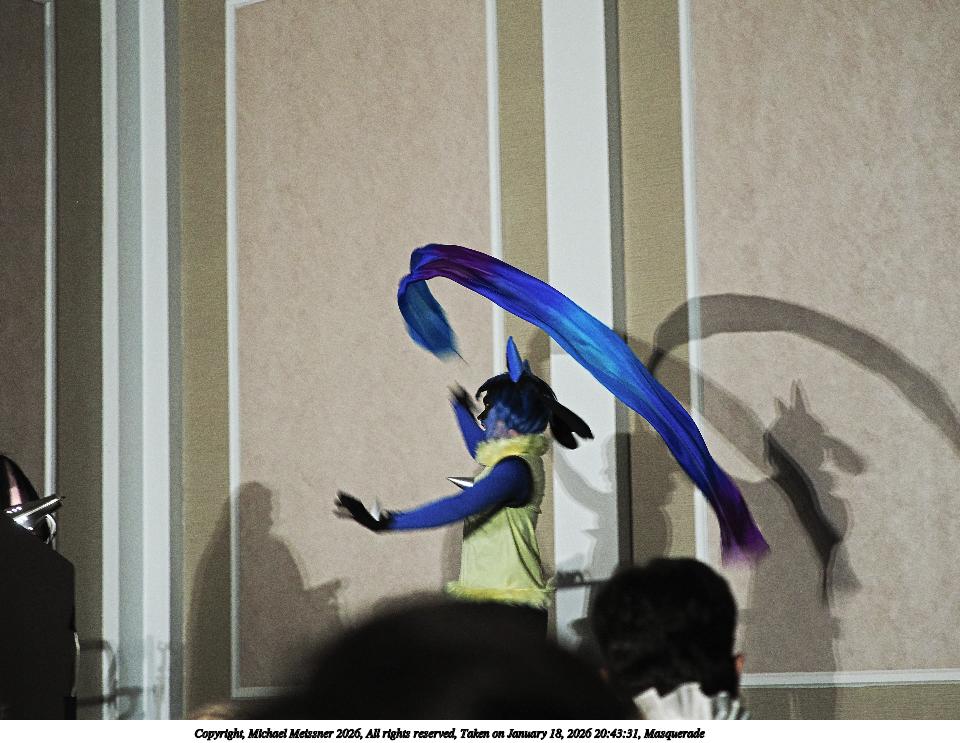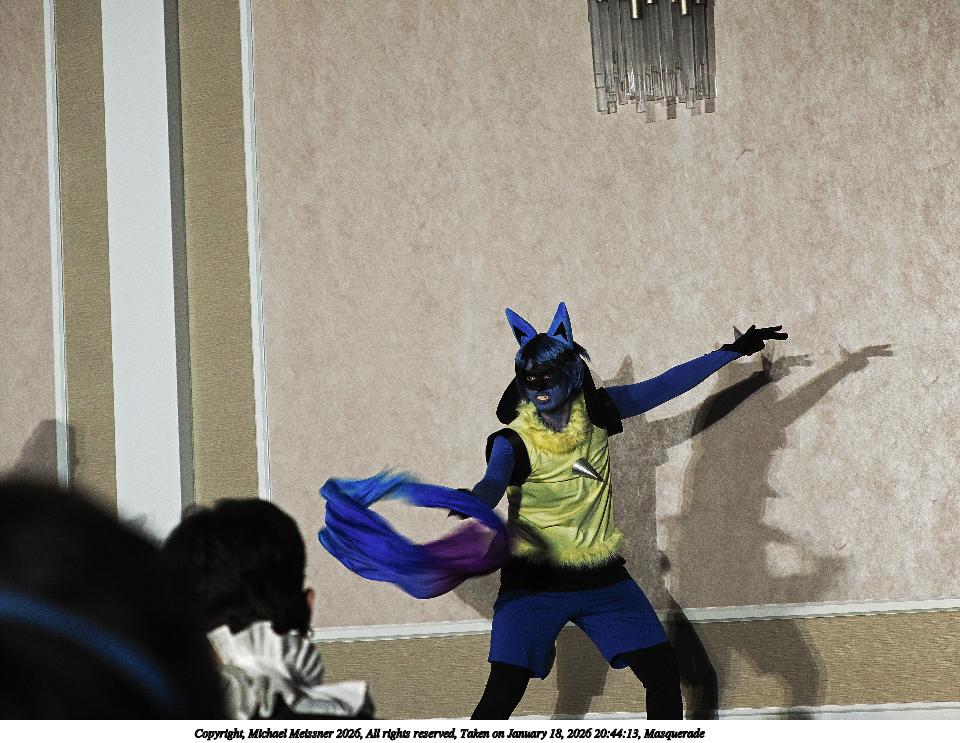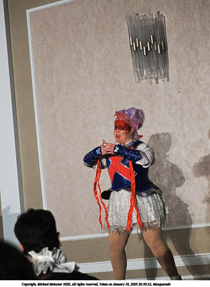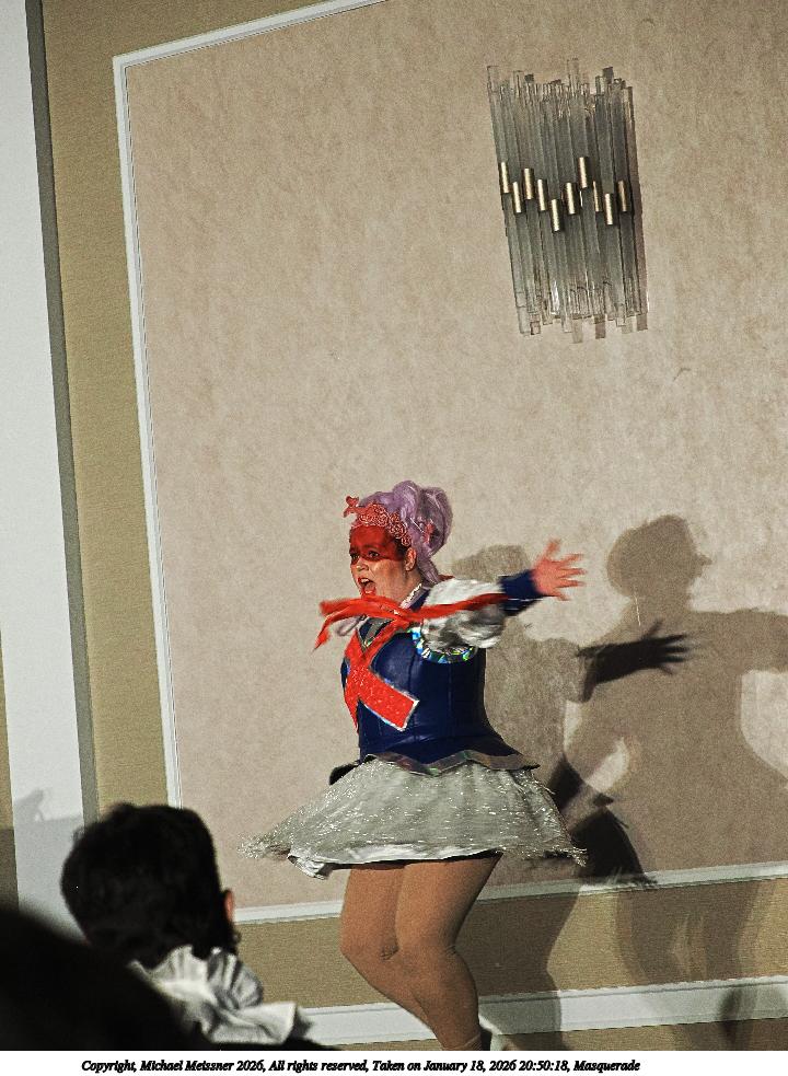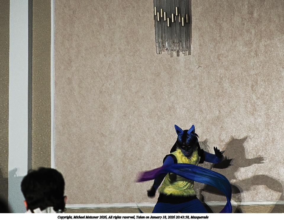 Picture #5: Masquerade #3 Thumb: 500x375, 40,124 bytes (40K) Small: 1000x773, 77,022 bytes (76K), (html file) Large: 4000x3000, 1,063,893 bytes (1.0M), (html file) Copyright, Michael Meissner 2026, All rights reserved OM OM1 camera with Olympus-m43 40-150mm f/2.8 lens f/3.2, ISO 4000, 1/200 sec, 95.0mm, auto mode, vivid color, matrix metering, continous focus, IS Auto, anti-shock 35mm equivalent focal length 190.0mm Programs used: crop, raw therapee Taken by Michael Meissner on January 18, 2026 20:29:12 Last modified on January 25, 2026 at 15:31 |