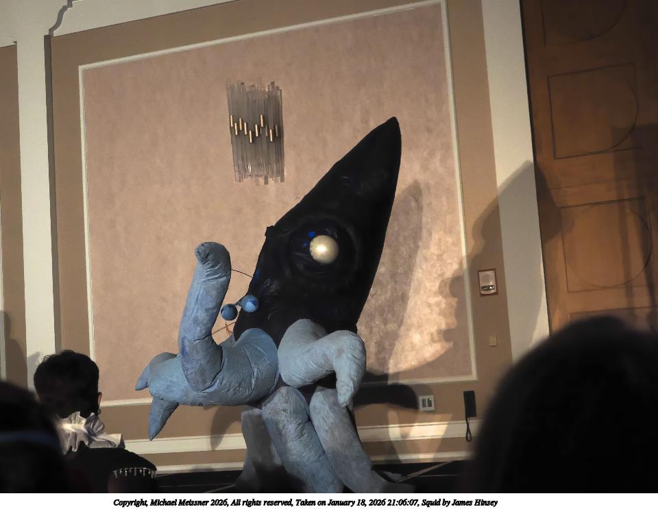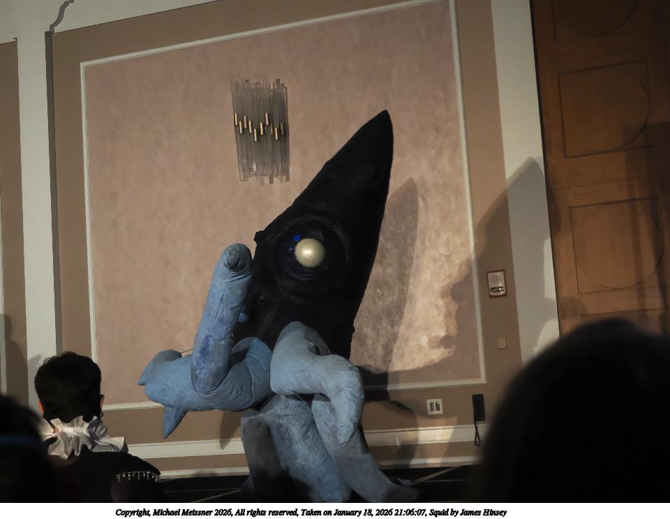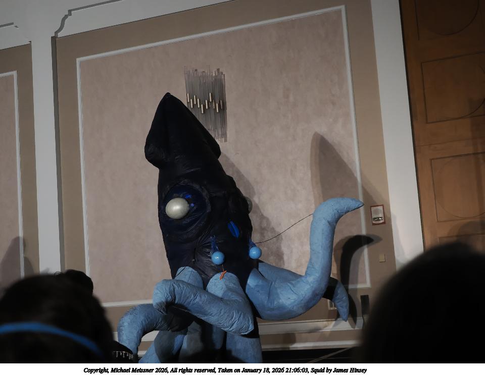 Picture #130: Squid by James Hinsey Thumb: 480x360, 45,089 bytes (45K) Small: 960x743, 92,113 bytes (90K), (html file) Large: 4800x3600, 1,651,632 bytes (1.6M), (html file) Copyright, Michael Meissner 2026, All rights reserved OM OM3 camera with Olympus-m43 12-40mm f/2.8 lens f/2.8, ISO 4000, 1/125 sec, 26.0mm, auto mode, vivid color, matrix metering, bias -0.3, IS Auto, face detection, subject human 35mm equivalent focal length 52.0mm Programs used: crop, raw therapee Taken by Michael Meissner on January 18, 2026 21:05:55 Last modified on January 25, 2026 at 18:46 |