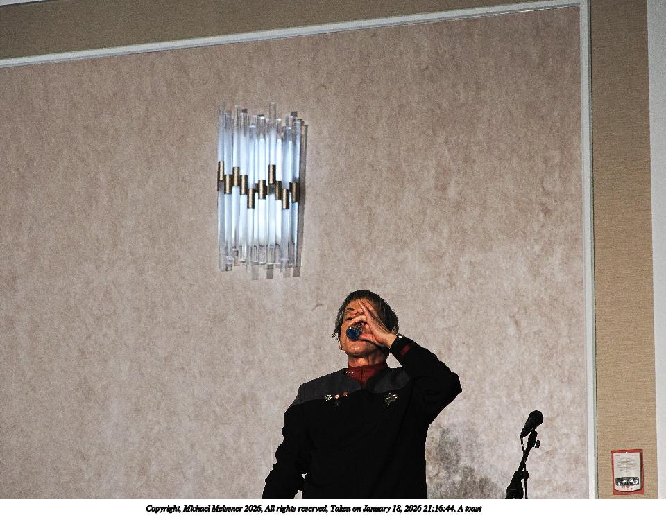 Picture #140: A toast Thumb: 480x360, 46,514 bytes (46K) Small: 960x743, 138,514 bytes (136K), (html file) Large: 4800x3600, 5,678,252 bytes (5.4M), (html file) Copyright, Michael Meissner 2026, All rights reserved OM OM1 camera with Olympus-m43 40-150mm f/2.8 lens f/2.8, ISO 1600, 1/80 sec, 40.0mm, auto mode, vivid color, matrix metering, continous focus, IS Auto, anti-shock 35mm equivalent focal length 80.0mm Programs used: crop, raw therapee Taken by Michael Meissner on January 18, 2026 21:16:44 Last modified on January 25, 2026 at 18:51 |