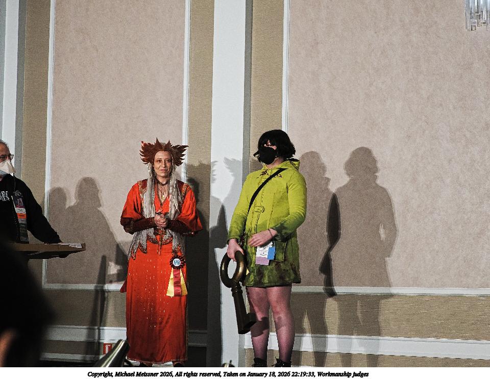 Picture #143: Workmanship judges Thumb: 480x360, 49,285 bytes (49K) Small: 960x743, 145,056 bytes (142K), (html file) Large: 4800x3600, 5,204,894 bytes (5.0M), (html file) Copyright, Michael Meissner 2026, All rights reserved OM OM1 camera with Olympus-m43 40-150mm f/2.8 lens f/2.8, ISO 2000, 1/80 sec, 40.0mm, auto mode, vivid color, matrix metering, continous focus, IS Auto, anti-shock 35mm equivalent focal length 80.0mm Programs used: crop, raw therapee Taken by Michael Meissner on January 18, 2026 22:19:33 Last modified on January 25, 2026 at 18:52 |