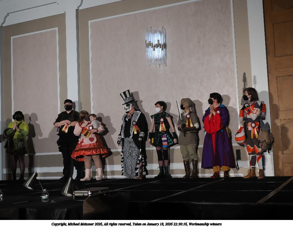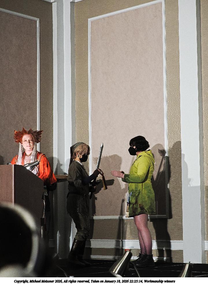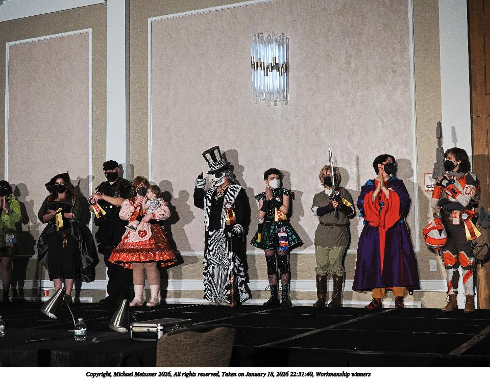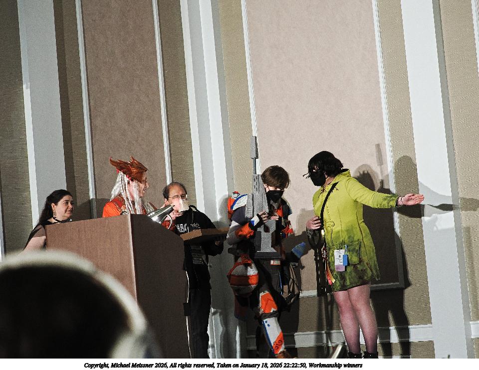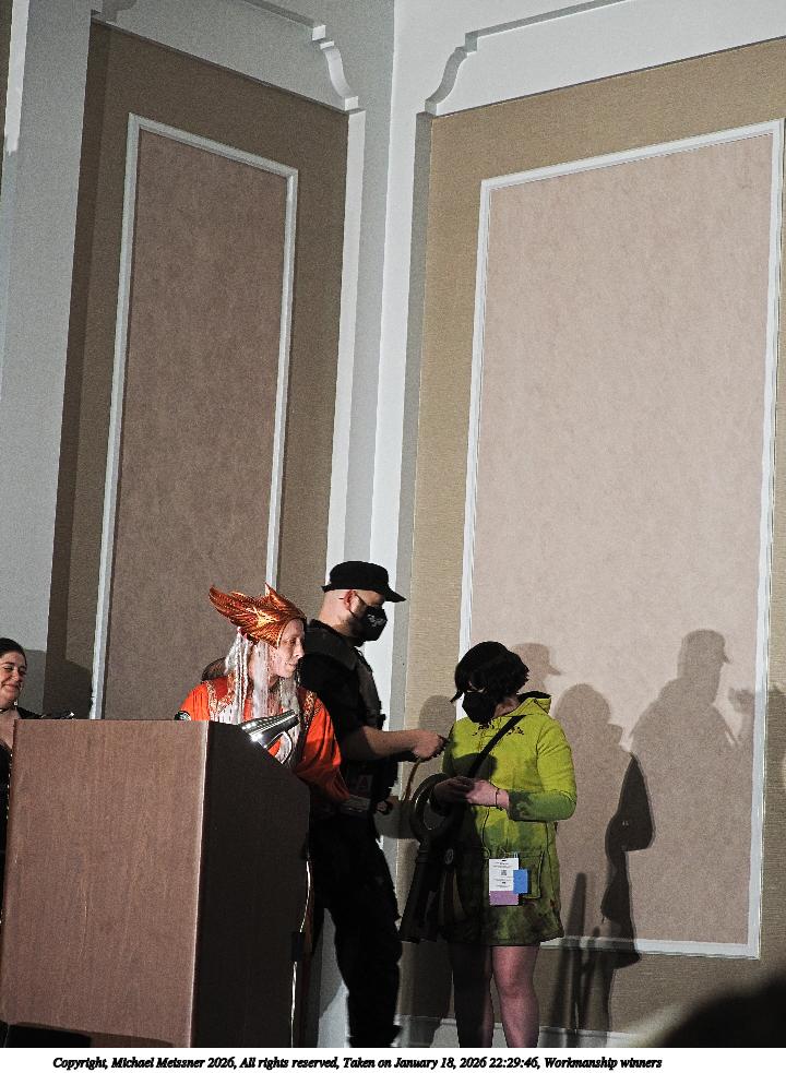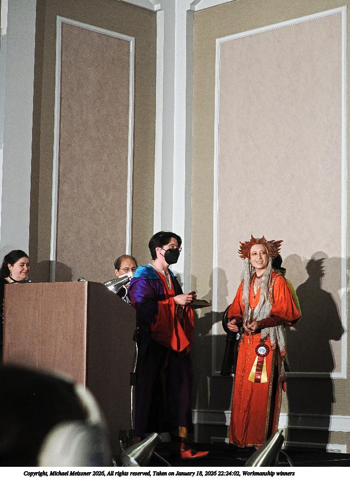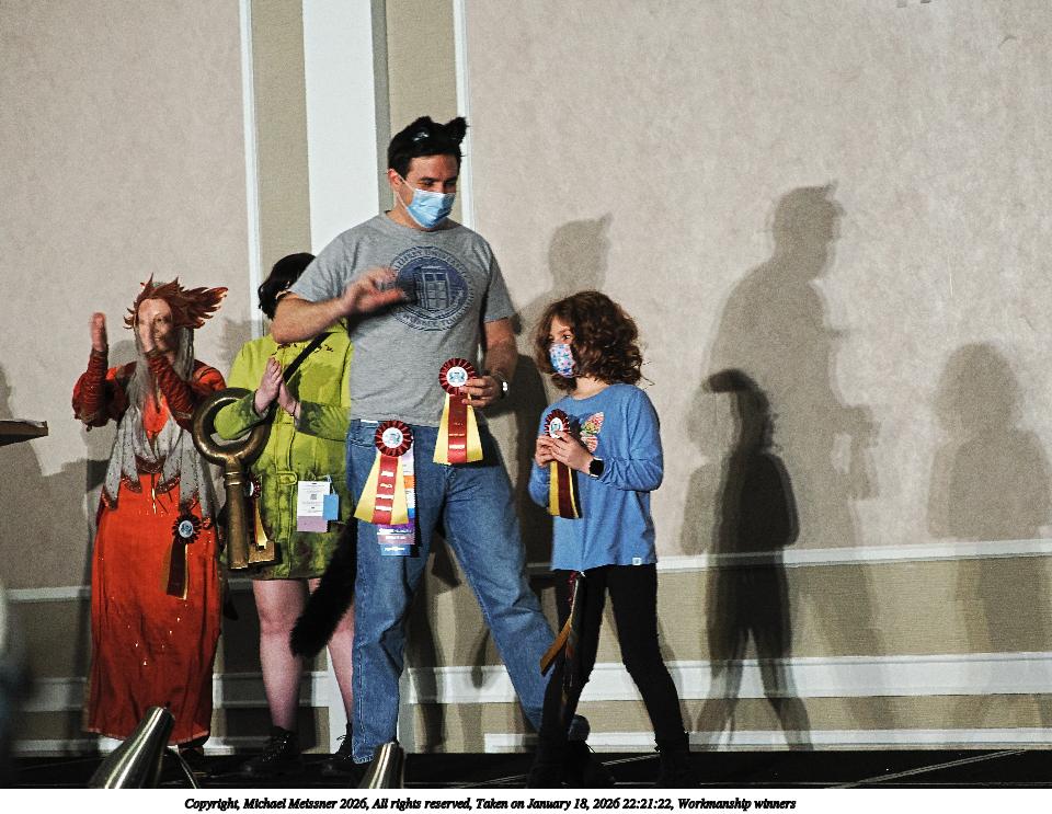Picture #144: Workmanship winners Thumb: 480x360, 54,113 bytes (53K) Small: 960x743, 144,193 bytes (141K), (html file) Large: 4800x3600, 4,827,553 bytes (4.6M), (html file) Copyright, Michael Meissner 2026, All rights reserved OM OM1 camera with Olympus-m43 40-150mm f/2.8 lens f/2.8, ISO 2500, 1/80 sec, 40.0mm, auto mode, vivid color, matrix metering, continous focus, IS Auto, anti-shock 35mm equivalent focal length 80.0mm Programs used: crop, raw therapee Taken by Michael Meissner on January 18, 2026 22:21:22 Last modified on January 25, 2026 at 18:53 |