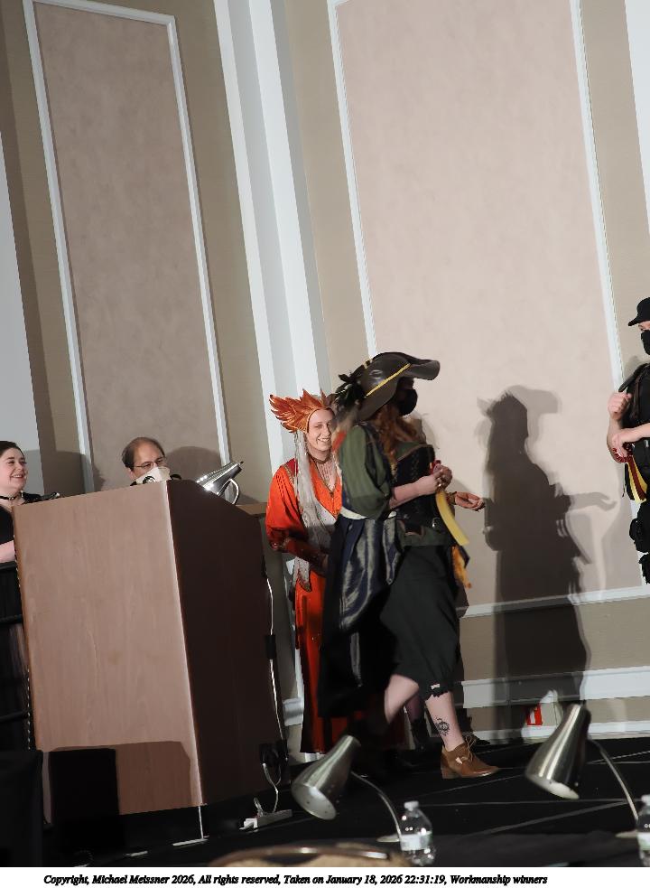 Picture #154: Workmanship winners #11 Thumb: 480x360, 49,684 bytes (49K) Small: 960x743, 112,239 bytes (110K), (html file) Large: 4800x3600, 1,955,249 bytes (1.9M), (html file) Copyright, Michael Meissner 2026, All rights reserved OM OM3 camera with Olympus-m43 12-40mm f/2.8 lens f/2.8, ISO 3200, 1/125 sec, 21.0mm, auto mode, vivid color, matrix metering, bias -0.3, IS Auto, face detection, subject human 35mm equivalent focal length 42.0mm Programs used: crop, raw therapee Taken by Michael Meissner on January 18, 2026 22:30:16 Last modified on January 25, 2026 at 18:57 |