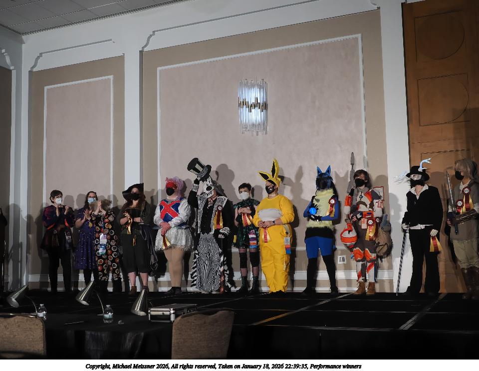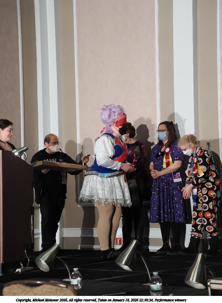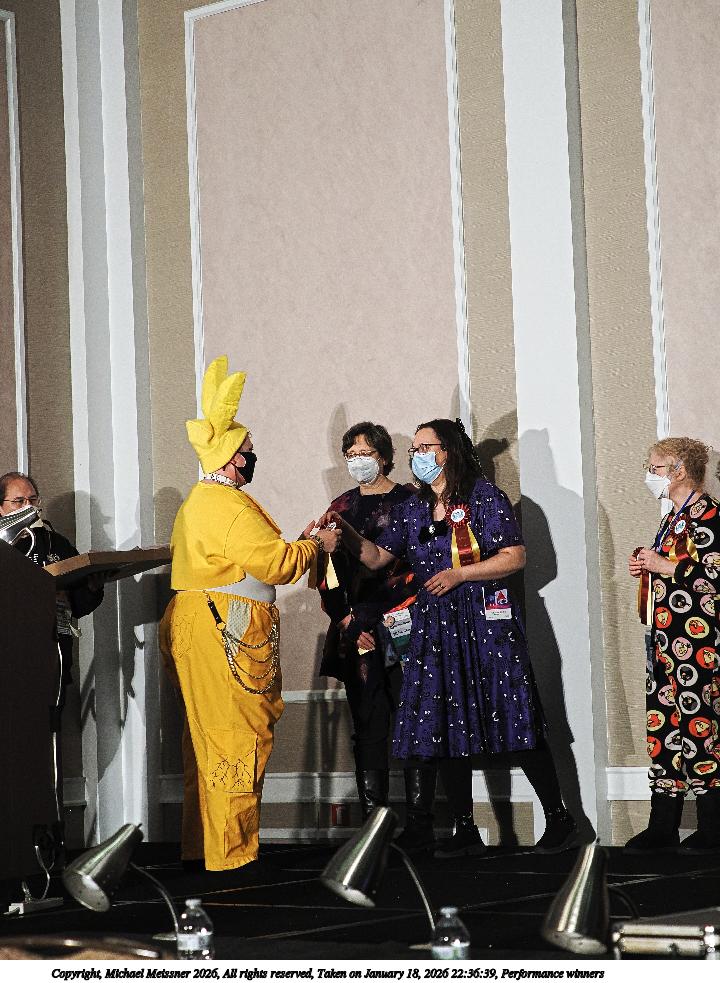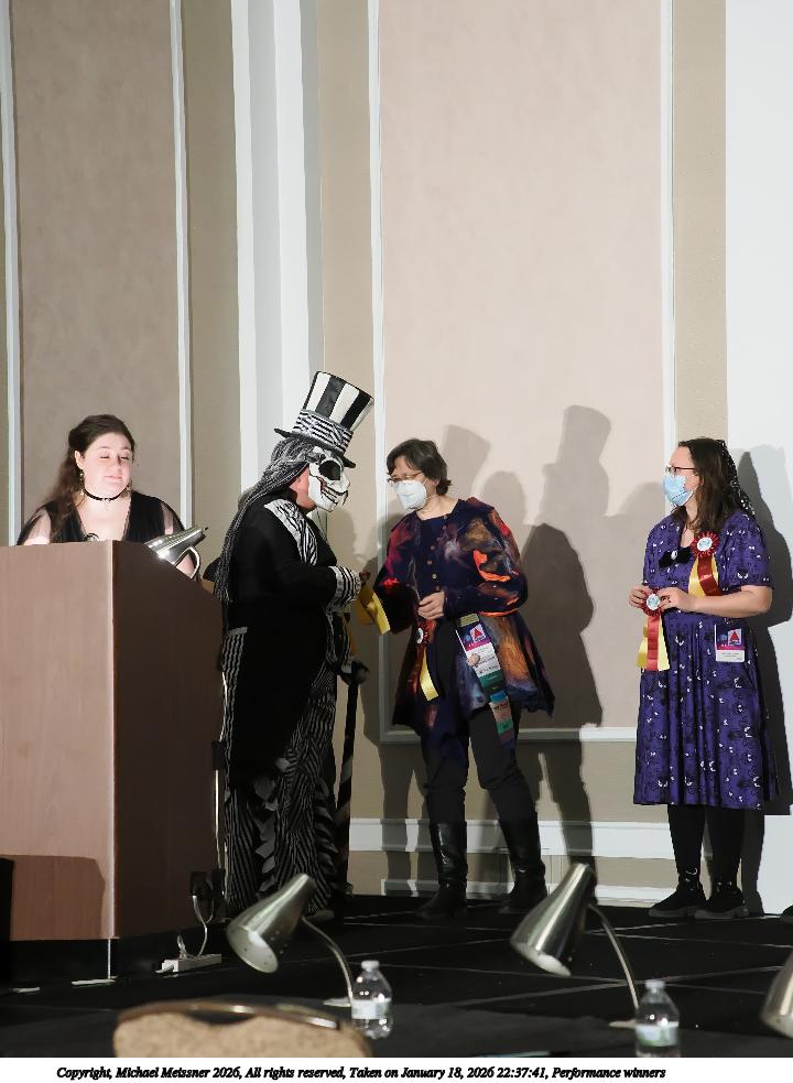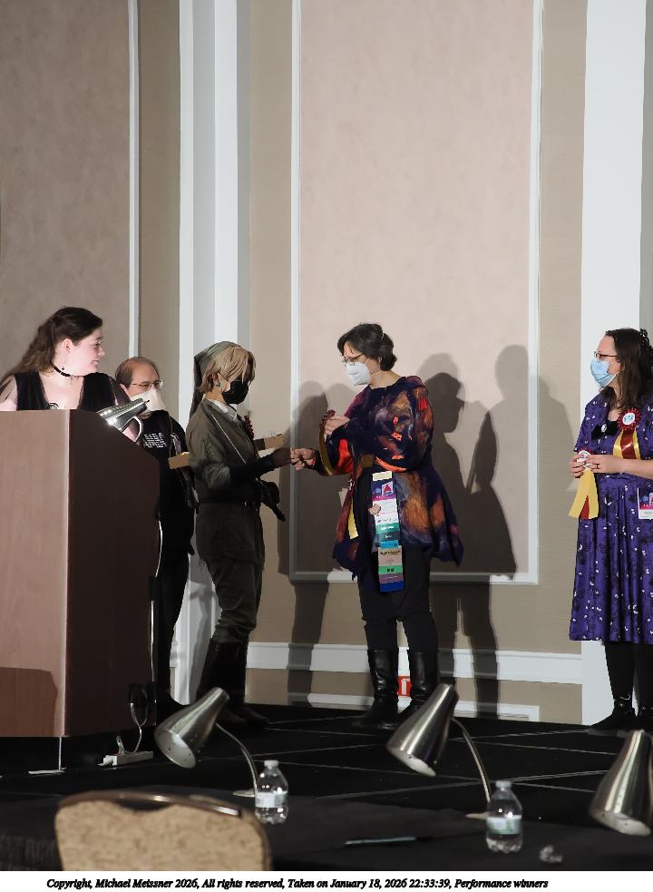 Picture #166: Performance winners #9 Thumb: 360x480, 50,865 bytes (50K) Small: 720x983, 110,207 bytes (108K), (html file) Large: 3600x4800, 1,817,526 bytes (1.7M), (html file) Copyright, Michael Meissner 2026, All rights reserved OM OM1 camera with Olympus-m43 40-150mm f/2.8 lens f/2.8, ISO 3200, 1/80 sec, 40.0mm, auto mode, vivid color, matrix metering, continous focus, IS Auto, anti-shock 35mm equivalent focal length 80.0mm Programs used: crop, raw therapee, rotate left Taken by Michael Meissner on January 18, 2026 22:38:24 Last modified on January 25, 2026 at 19:00 |