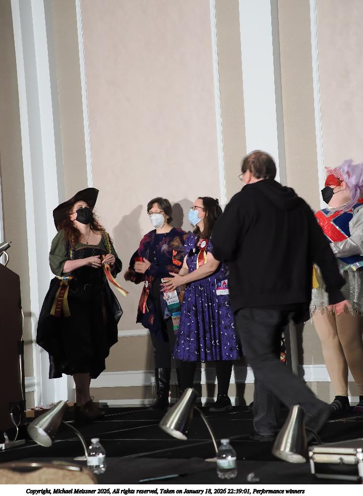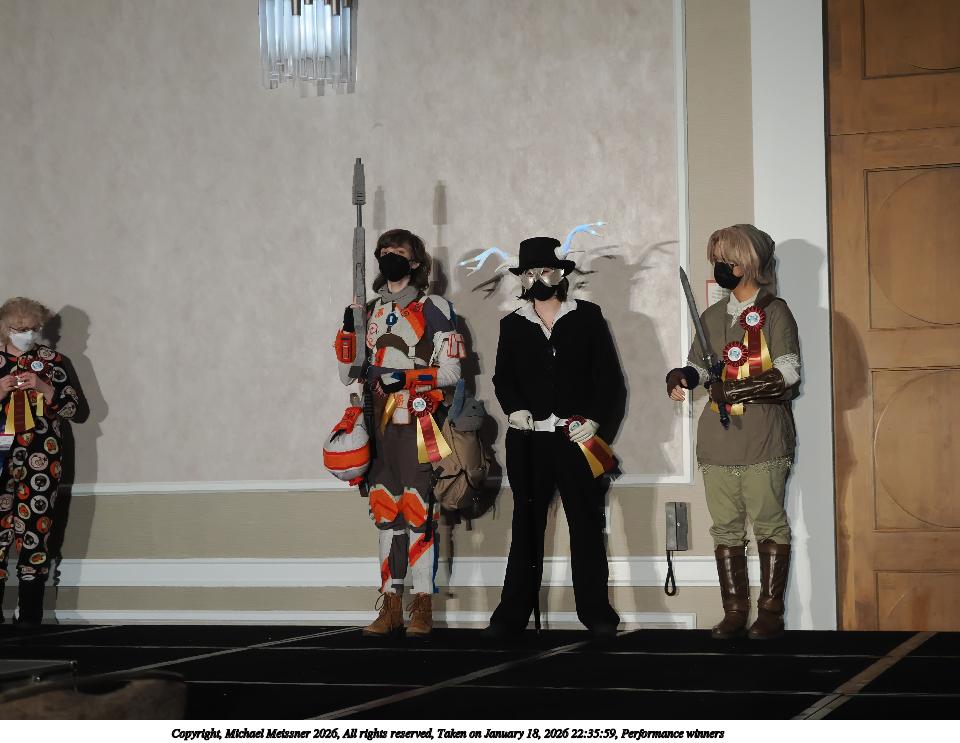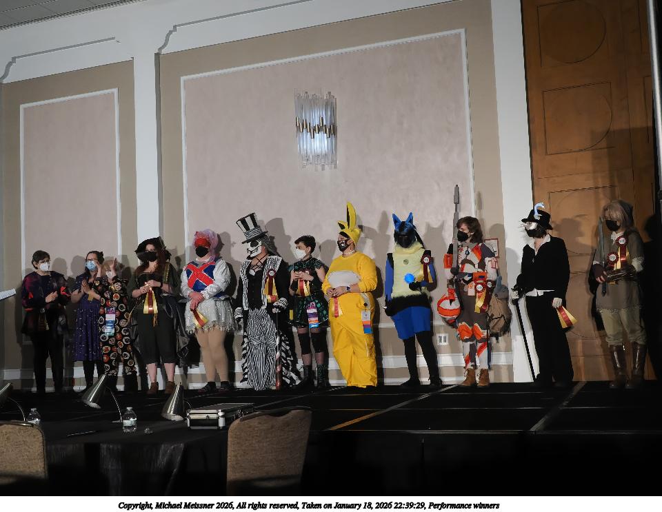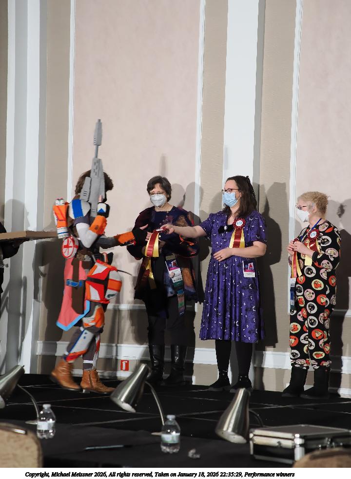 Picture #166: Performance winners #9 Thumb: 360x480, 50,865 bytes (50K) Small: 720x983, 110,207 bytes (108K), (html file) Large: 3600x4800, 1,817,526 bytes (1.7M), (html file) Copyright, Michael Meissner 2026, All rights reserved OM OM1 camera with Olympus-m43 40-150mm f/2.8 lens f/2.8, ISO 3200, 1/80 sec, 40.0mm, auto mode, vivid color, matrix metering, continous focus, IS Auto, anti-shock 35mm equivalent focal length 80.0mm Programs used: crop, raw therapee, rotate left Taken by Michael Meissner on January 18, 2026 22:38:24 Last modified on January 25, 2026 at 19:00 |