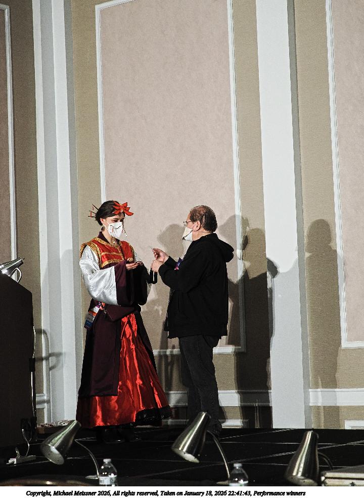 Picture #164: Performance winners #7 Thumb: 360x480, 50,670 bytes (50K) Small: 720x983, 111,246 bytes (109K), (html file) Large: 3600x4800, 1,881,465 bytes (1.8M), (html file) Copyright, Michael Meissner 2026, All rights reserved OM OM1 camera with Olympus-m43 40-150mm f/2.8 lens f/2.8, ISO 3200, 1/80 sec, 40.0mm, auto mode, vivid color, matrix metering, continous focus, IS Auto, anti-shock 35mm equivalent focal length 80.0mm Programs used: crop, raw therapee, rotate left Taken by Michael Meissner on January 18, 2026 22:37:03 Last modified on January 25, 2026 at 19:00 |