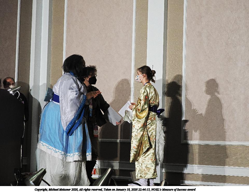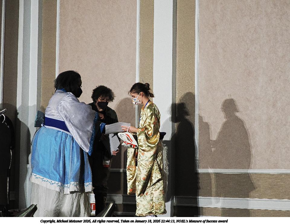 Picture #174: NOEL's Measure of Success award #2 Thumb: 480x360, 51,007 bytes (50K) Small: 960x743, 153,117 bytes (150K), (html file) Large: 4800x3600, 5,272,699 bytes (5.0M), (html file) Copyright, Michael Meissner 2026, All rights reserved OM OM1 camera with Olympus-m43 40-150mm f/2.8 lens f/2.8, ISO 2000, 1/80 sec, 40.0mm, auto mode, vivid color, matrix metering, continous focus, IS Auto, anti-shock 35mm equivalent focal length 80.0mm Programs used: crop, raw therapee Taken by Michael Meissner on January 18, 2026 22:44:04 Last modified on January 25, 2026 at 19:03 |