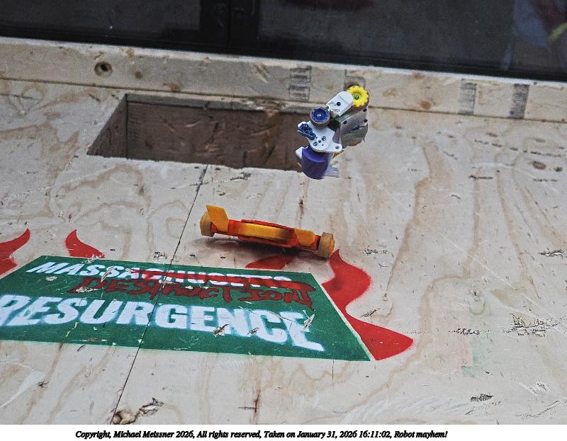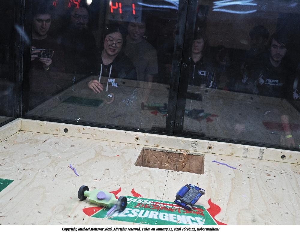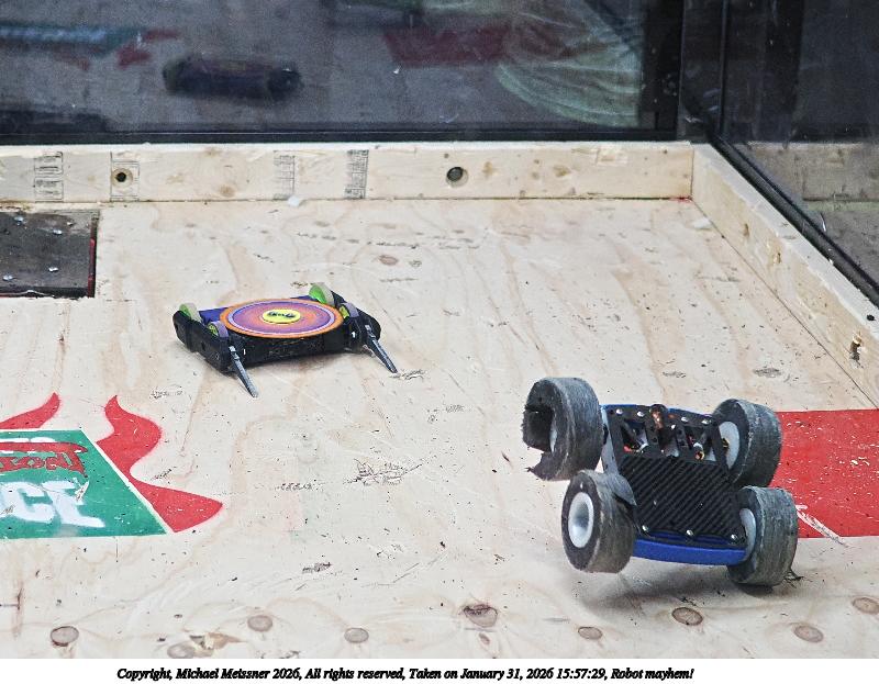 Picture #10: Robot mayhem! #28 Small: 900x698, 110,014 bytes (108K), (html file) Large: 3600x2700, 2,233,538 bytes (2.1M), (html file) Copyright, Michael Meissner 2026, All rights reserved OM OM3 camera with OM 20mm f/1.4 lens f/1.4, ISO 500, 1/1000 sec, 20.0mm, auto mode, vivid color, matrix metering, continous focus, IS Auto, face detection, subject motorsports (not found) 35mm equivalent focal length 40.0mm Programs used: crop, raw therapee Taken by Michael Meissner on January 31, 2026 16:28:12 Last modified on February 01, 2026 at 16:15 |