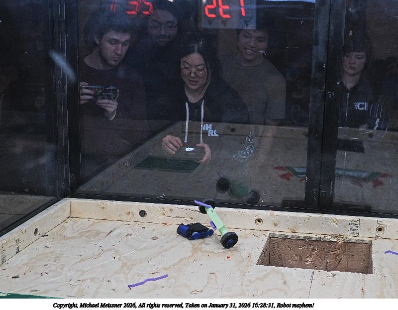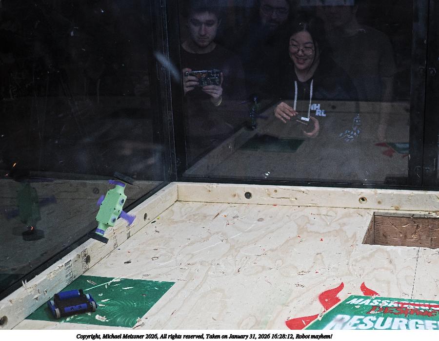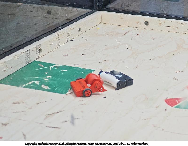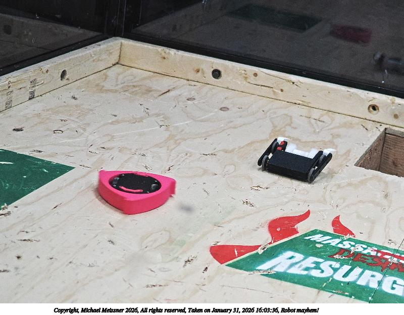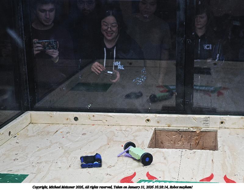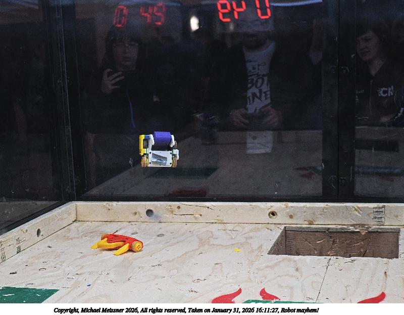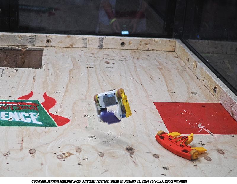 Picture #12: Robot mayhem! #26 Small: 800x623, 99,068 bytes (97K), (html file) Large: 2400x1800, 1,070,828 bytes (1.0M), (html file) Copyright, Michael Meissner 2026, All rights reserved OM OM3 camera with OM 20mm f/1.4 lens f/1.4, ISO 400, 1/1000 sec, 20.0mm, auto mode, vivid color, matrix metering, continous focus, IS Auto, face detection, subject motorsports (not found) 35mm equivalent focal length 40.0mm Programs used: crop, raw therapee Taken by Michael Meissner on January 31, 2026 16:22:52 Last modified on February 01, 2026 at 16:14 |