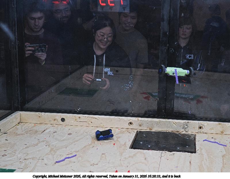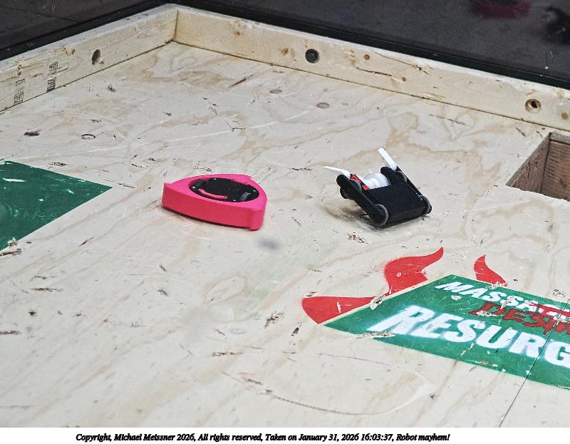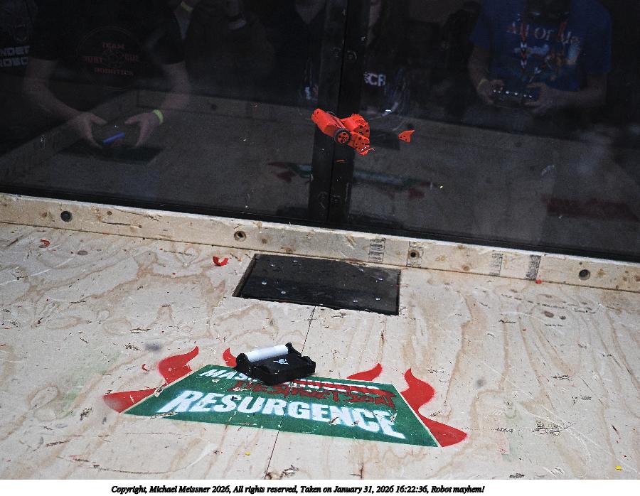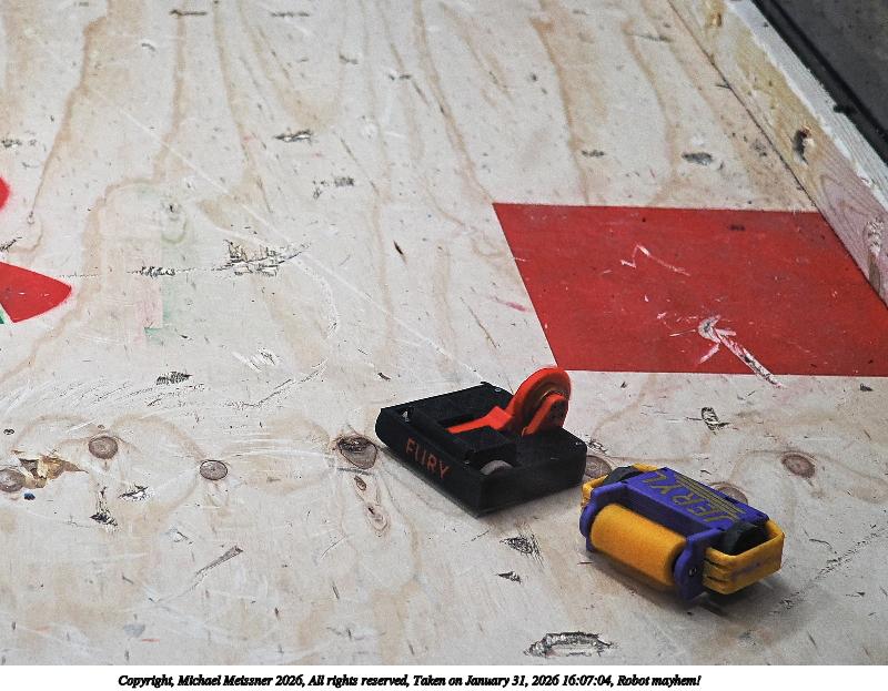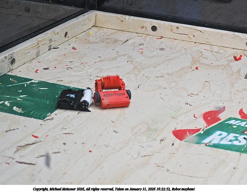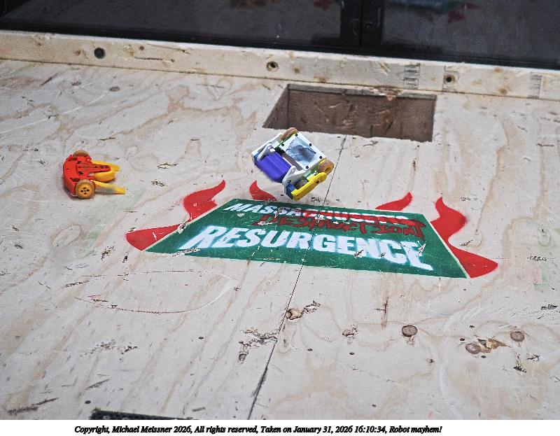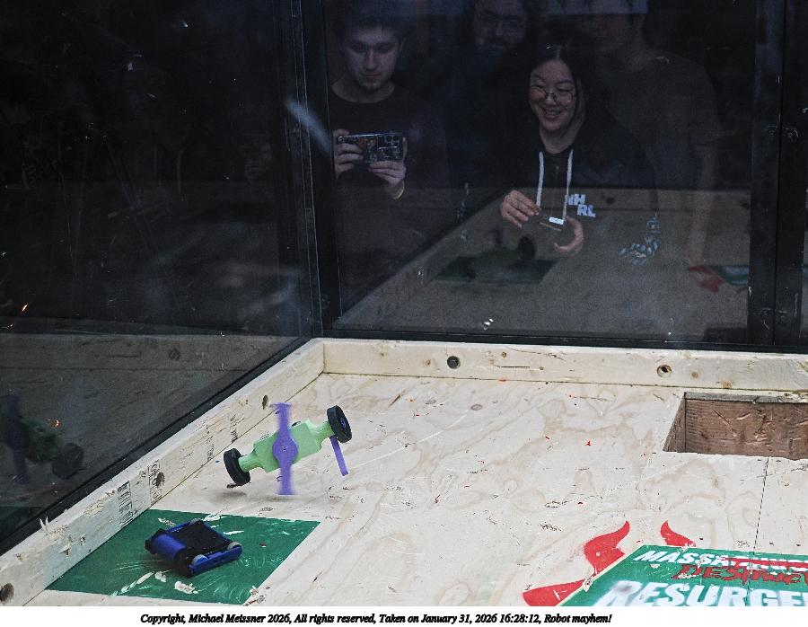 Picture #12: Robot mayhem! #26 Small: 800x623, 99,068 bytes (97K), (html file) Large: 2400x1800, 1,070,828 bytes (1.0M), (html file) Copyright, Michael Meissner 2026, All rights reserved OM OM3 camera with OM 20mm f/1.4 lens f/1.4, ISO 400, 1/1000 sec, 20.0mm, auto mode, vivid color, matrix metering, continous focus, IS Auto, face detection, subject motorsports (not found) 35mm equivalent focal length 40.0mm Programs used: crop, raw therapee Taken by Michael Meissner on January 31, 2026 16:22:52 Last modified on February 01, 2026 at 16:14 |