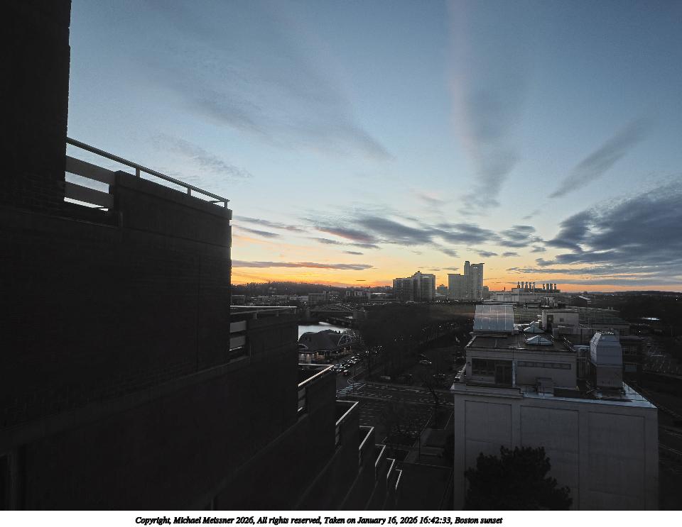 Picture #2: Boston sunset #2 960x743, 95,504 bytes (94K), (html file) Copyright, Michael Meissner 2026, All rights reserved OM OM3 camera with OM 20mm f/1.4 lens f/2.8, ISO 200, 1/125 sec, 20.0mm, auto mode, natural color, matrix metering, IS Auto, stacked hdr1, face detection 35mm equivalent focal length 40.0mm Programs used: crop, raw therapee Taken by Michael Meissner on January 16, 2026 16:48:37 Last modified on January 22, 2026 at 11:13 |