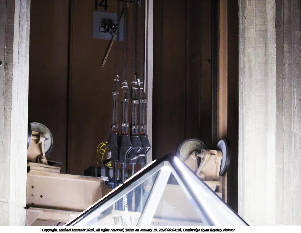 Picture #2: Cambridge Hyatt Regency elevator 960x743, 104,765 bytes (103K), (html file) Copyright, Michael Meissner 2026, All rights reserved OM OM1 camera with Olympus-m43 40-150mm f/2.8 lens f/2.8, ISO 12800, 1/160 sec, 142.0mm, auto mode, vivid color, matrix metering, continous focus, IS Auto, anti-shock 35mm equivalent focal length 284.0mm Programs used: crop, raw therapee Taken by Michael Meissner on January 19, 2026 00:04:26 Last modified on January 22, 2026 at 11:29 |