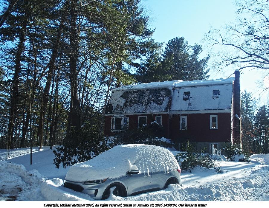 Picture #14: Our house in winter 900x698, 229,624 bytes (225K), (html file) Copyright, Michael Meissner 2026, All rights reserved Olympus Stylus-1 camera f/3.5, ISO 100, 1/500 sec, 6.7mm, auto mode, vivid color, SHQ, matrix metering, IS Auto, noise reduction auto 35mm equivalent focal length 32.0mm Programs used: crop, raw therapee Taken by Michael Meissner on January 28, 2026 14:08:07 Last modified on January 29, 2026 at 18:25 |