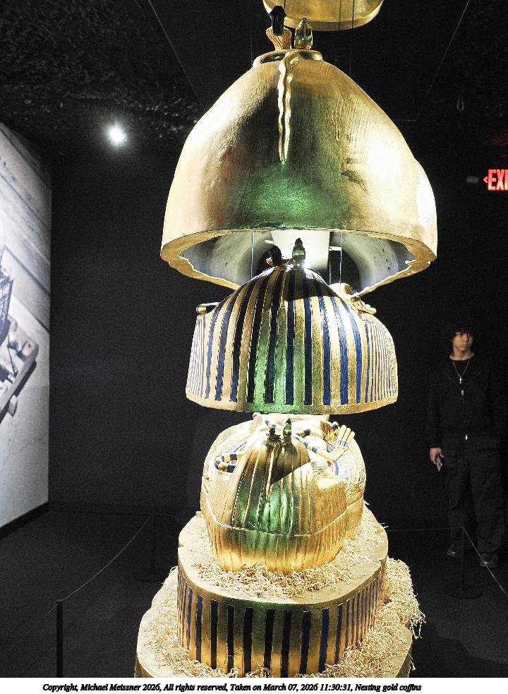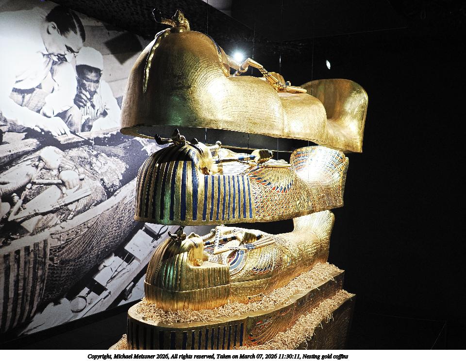 Picture #59: Nesting gold coffins 720x983, 221,002 bytes (216K), (html file) Copyright, Michael Meissner 2026, All rights reserved OM OM3 camera with Panasonic-Leica 15mm f/1.7 lens f/1.8, ISO 200, 1/60 sec, 15.0mm, auto mode, vivid color, matrix metering, continous focus, IS Auto, face detection, anti-shock 35mm equivalent focal length 30.0mm Programs used: crop, raw therapee, rotate left Taken by Michael Meissner on March 07, 2026 11:29:11 Last modified on March 07, 2026 at 21:01 |